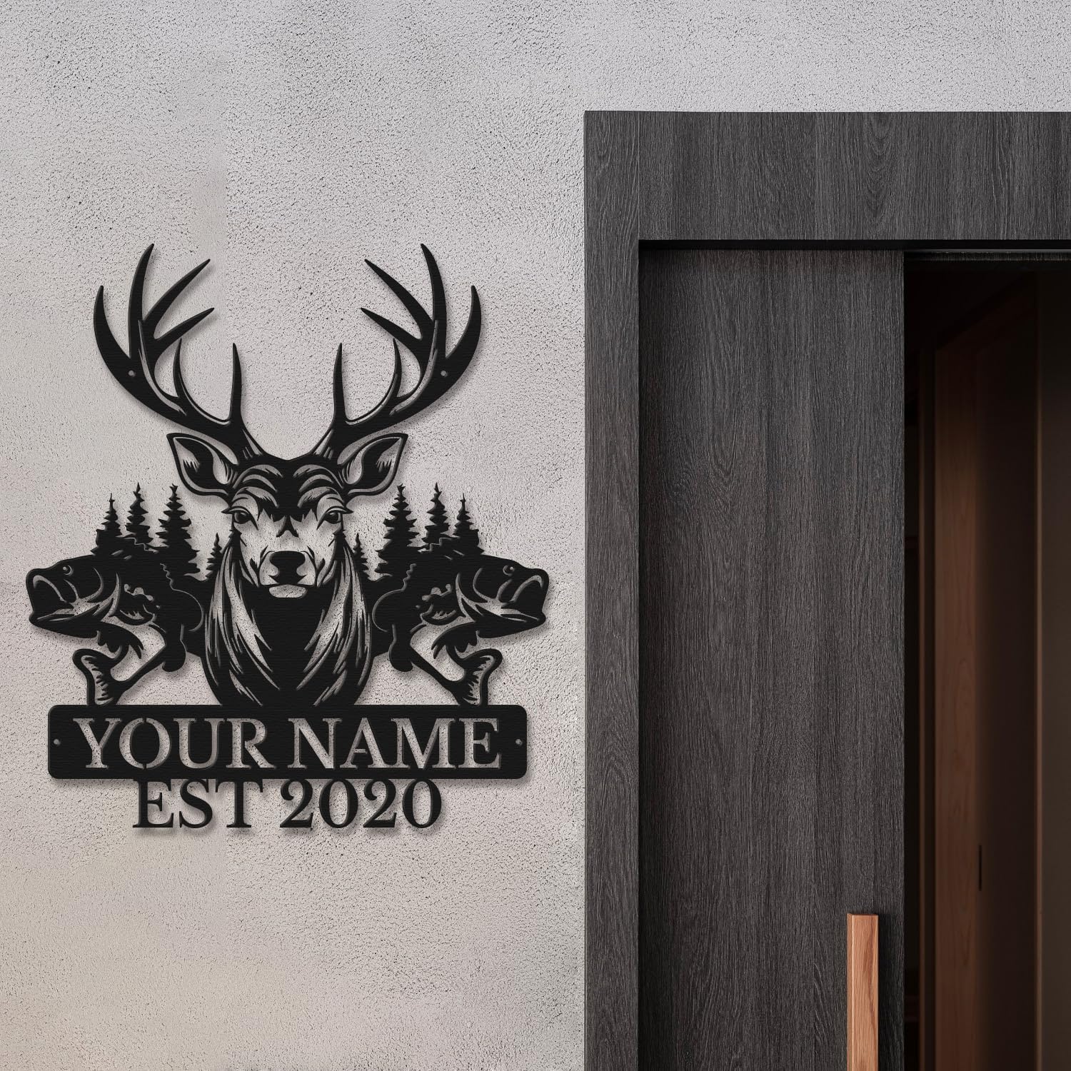Personalized Custom Forest Deer and Fish Wall Decor, Metal Signs, Black Metal Wall Art, Custom Name Signs for Dad's Shed, Camping and Hunting Decor