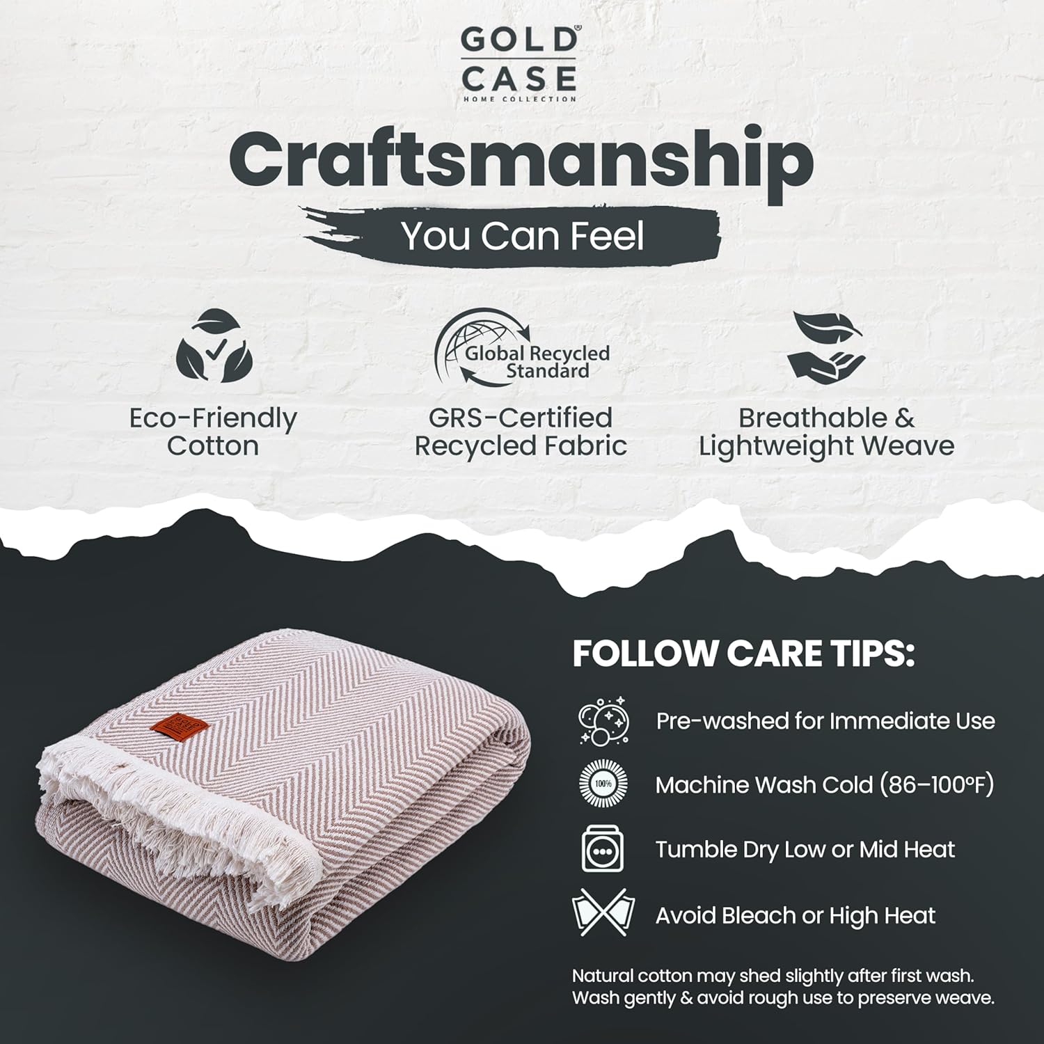 Gold Case Throw Blanket for Bed – 100% Recycled Turkish Cotton Bed Blanket – Decorative Throw Cotton Blankets for Living Room & Bedroom – Elegant Beige Woven Queen Blankets – 90x90