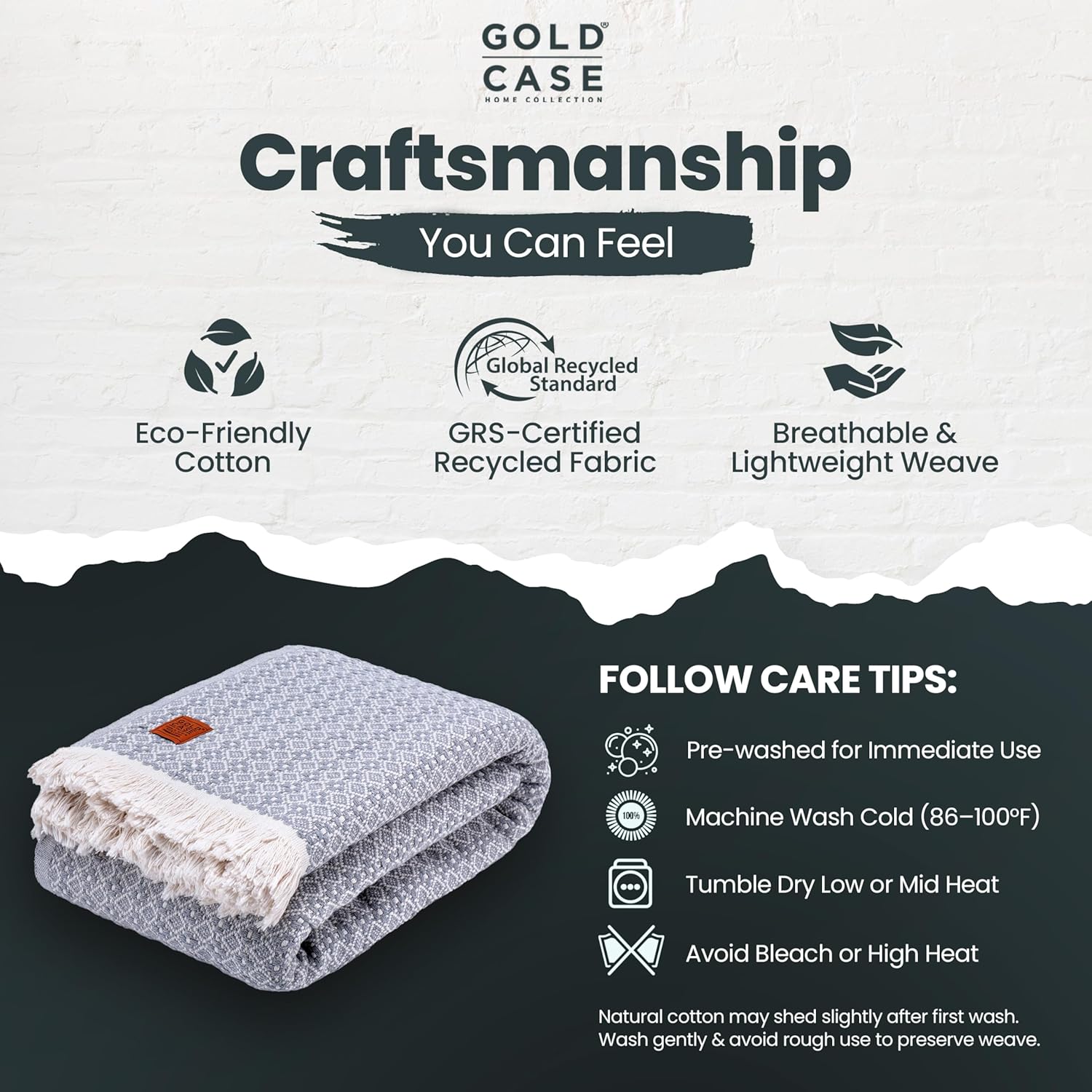Gold Case Throw Blanket for Bed – 100% Recycled Turkish Cotton Bed Blanket – Decorative Throw Cotton Blankets for Living Room & Bedroom – Retro Grey Woven Queen Blankets – 90x90