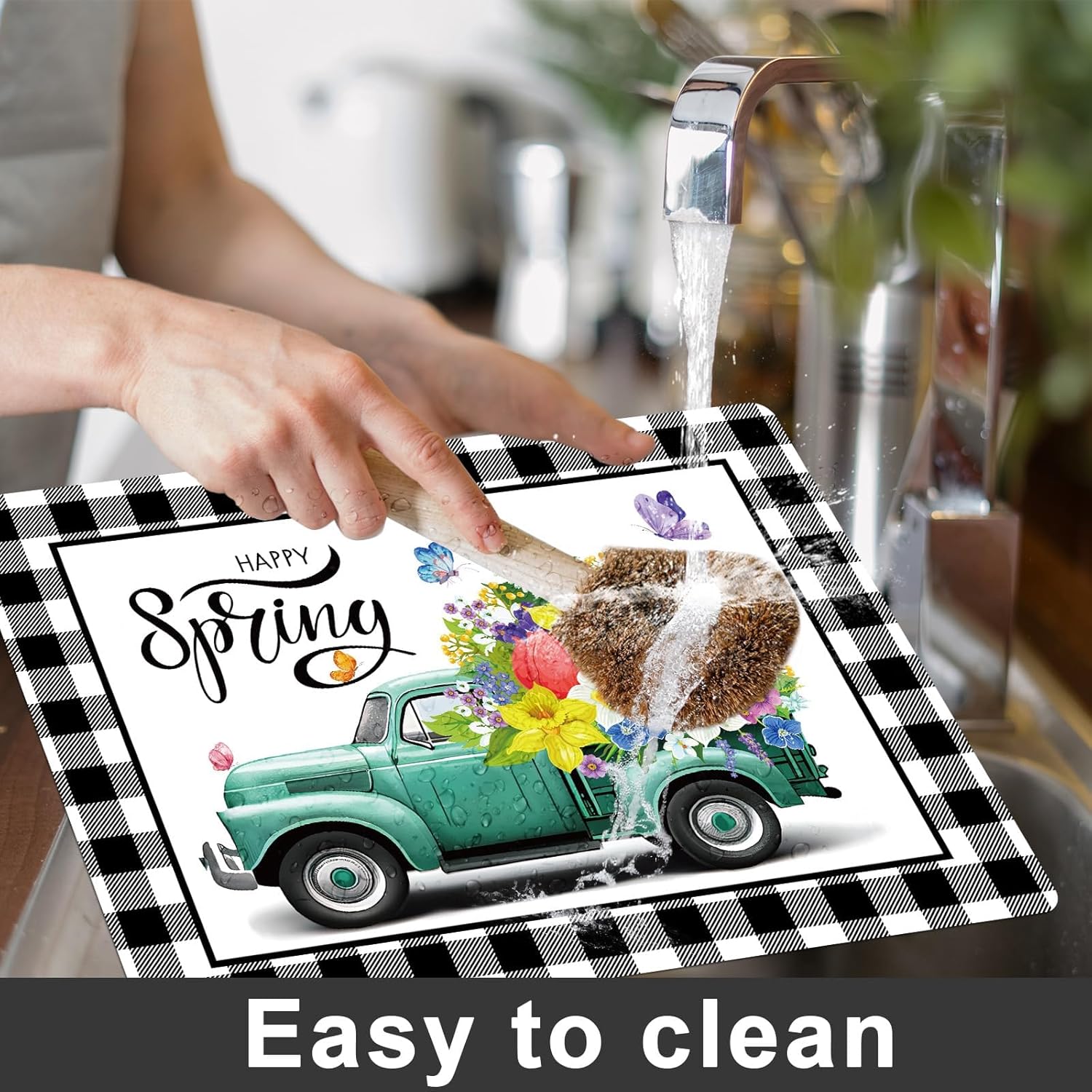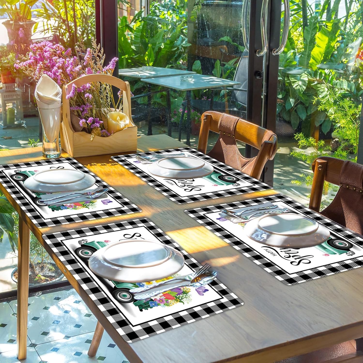 - Eye-catching design:The design of the seasonal spring placemats incorporates classic elements of truck with flowers,which will create a cheerful atmosphere for your spring party.