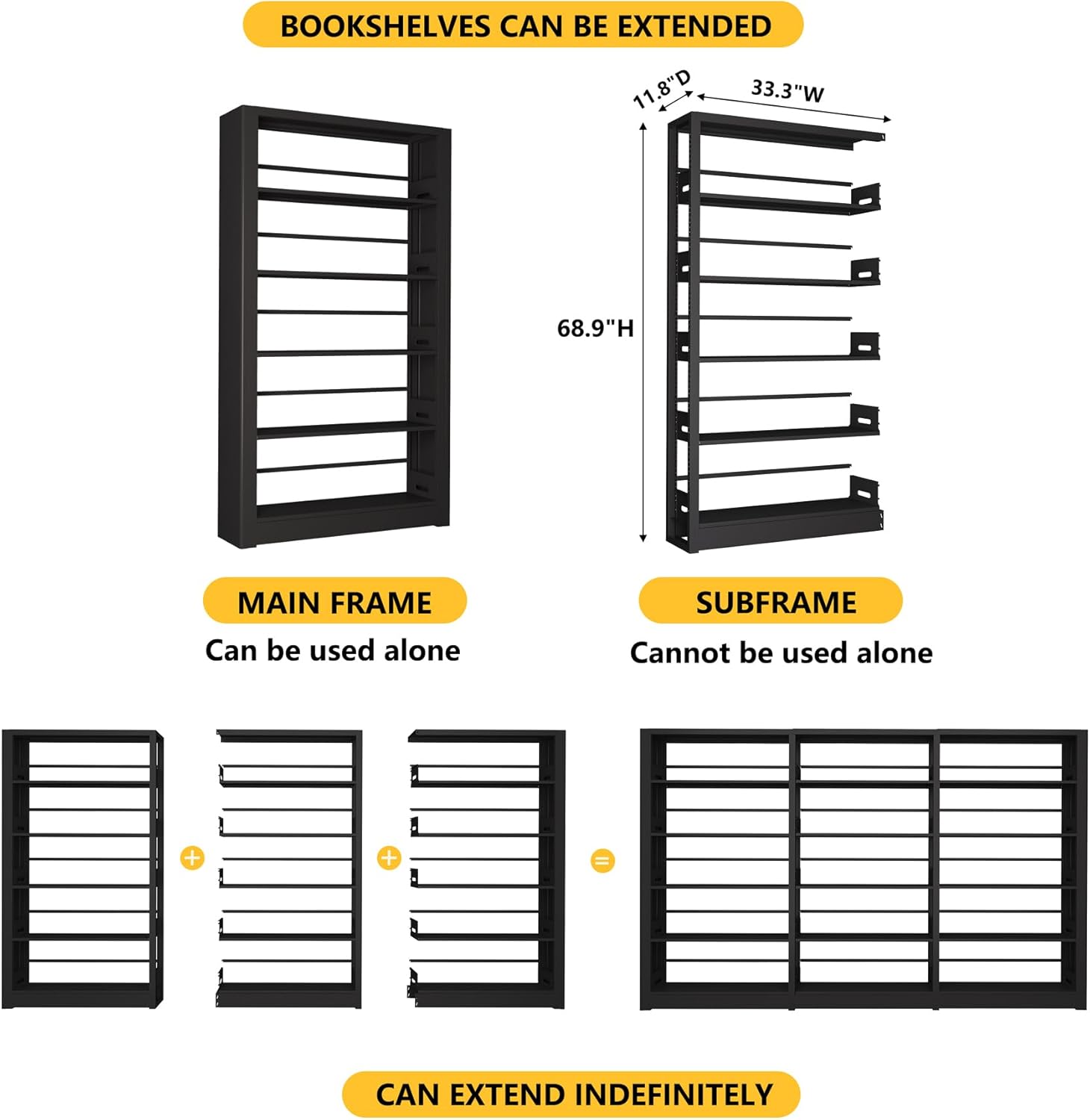 - 【Extra Large Storage Space】:The wide office bookshelf size is 68.9* width 36* depth 11.8 inches. The open bookshelf has 5 tiers, you can adjust the height at will according to your needs, use it to place books, trophies, potted plants and so on. Meanwhile, the metal shelves come with adjustable stoppers to protect your items from falling. Modular Bookshelf with modular expansion capability can placed more heavy books.