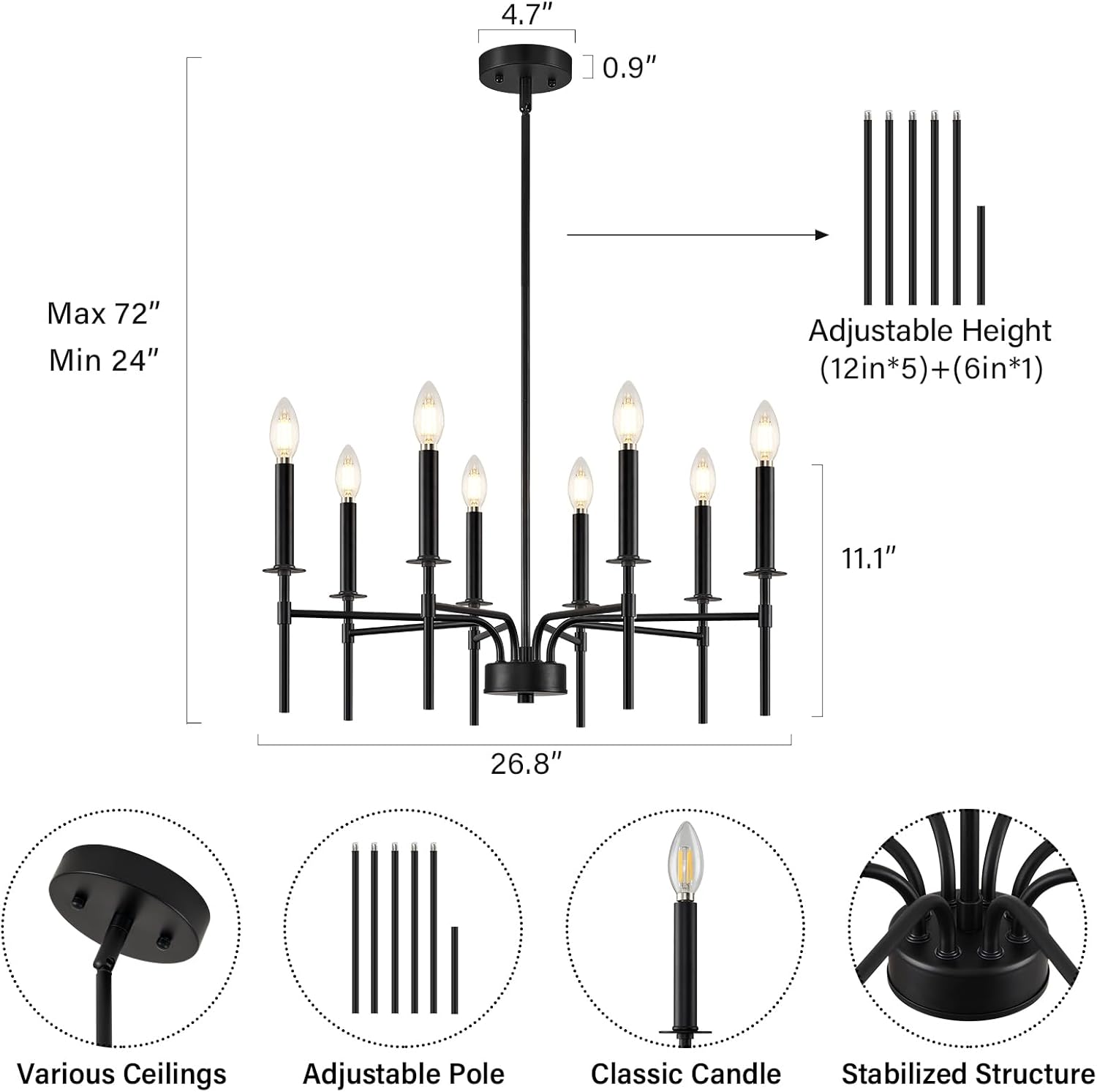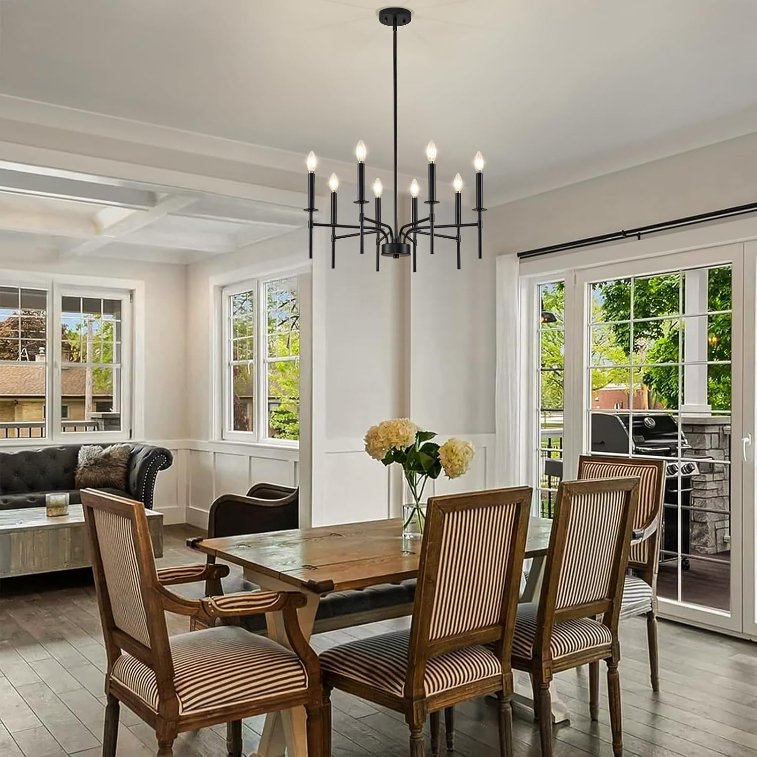 - Dimmable and E12 Bulb Compatibility: With 8 E12 candelabra sockets, this black chandelier is compatible with various E12 bulbs (incandescent, LED, CFL, and halogen, 40W MAX / bulb), offering dimmable functionality to create the perfect ambiance. This black matte chandelier allows for flexible lighting control, making it suitable as a black chandeliers for dining room, or master bedroom chandelier (NOTE: bulbs and dimmer are NOT included)