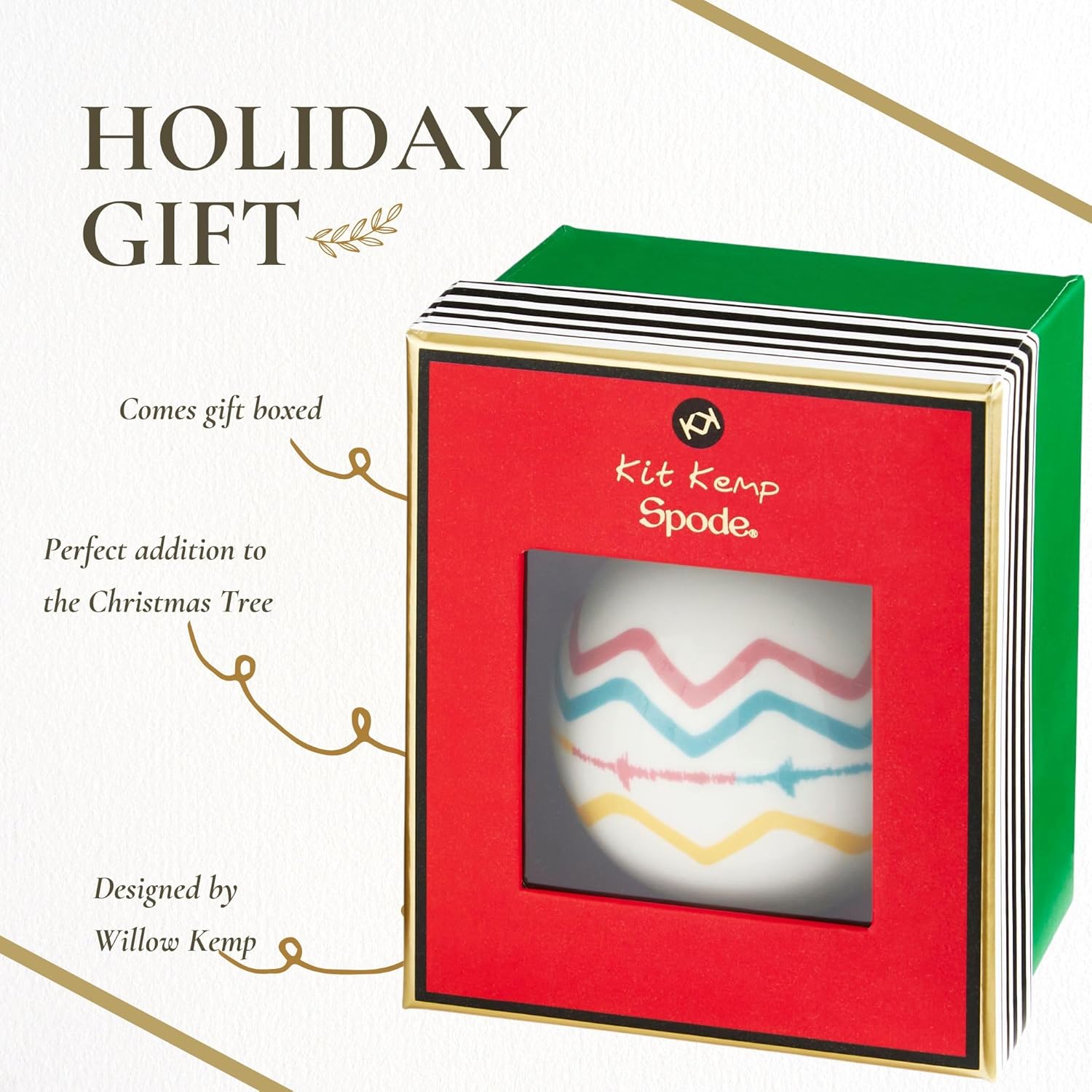 - Charming Whimsy: The Kit Kemp Rik Rak ornament features a vibrant zig-zak illustration that adds a unique and playful touch to your Christmas tree ornaments, perfect for infusing your holiday decor with fun and festive spirit.