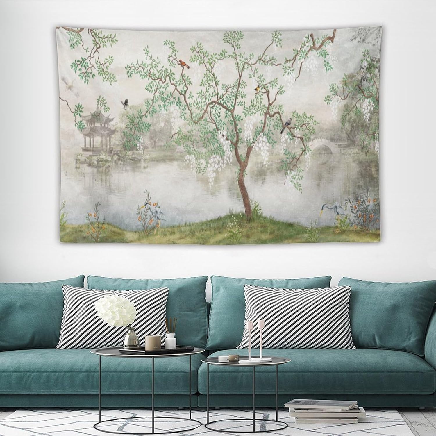 HZOHNAGO Japanese Tapestry Tree Misty Garden Lake Printed Wall Tapestry Ink Painting Wall Hanging for Bedroom Living Room Dorm 60" W x 40" H
