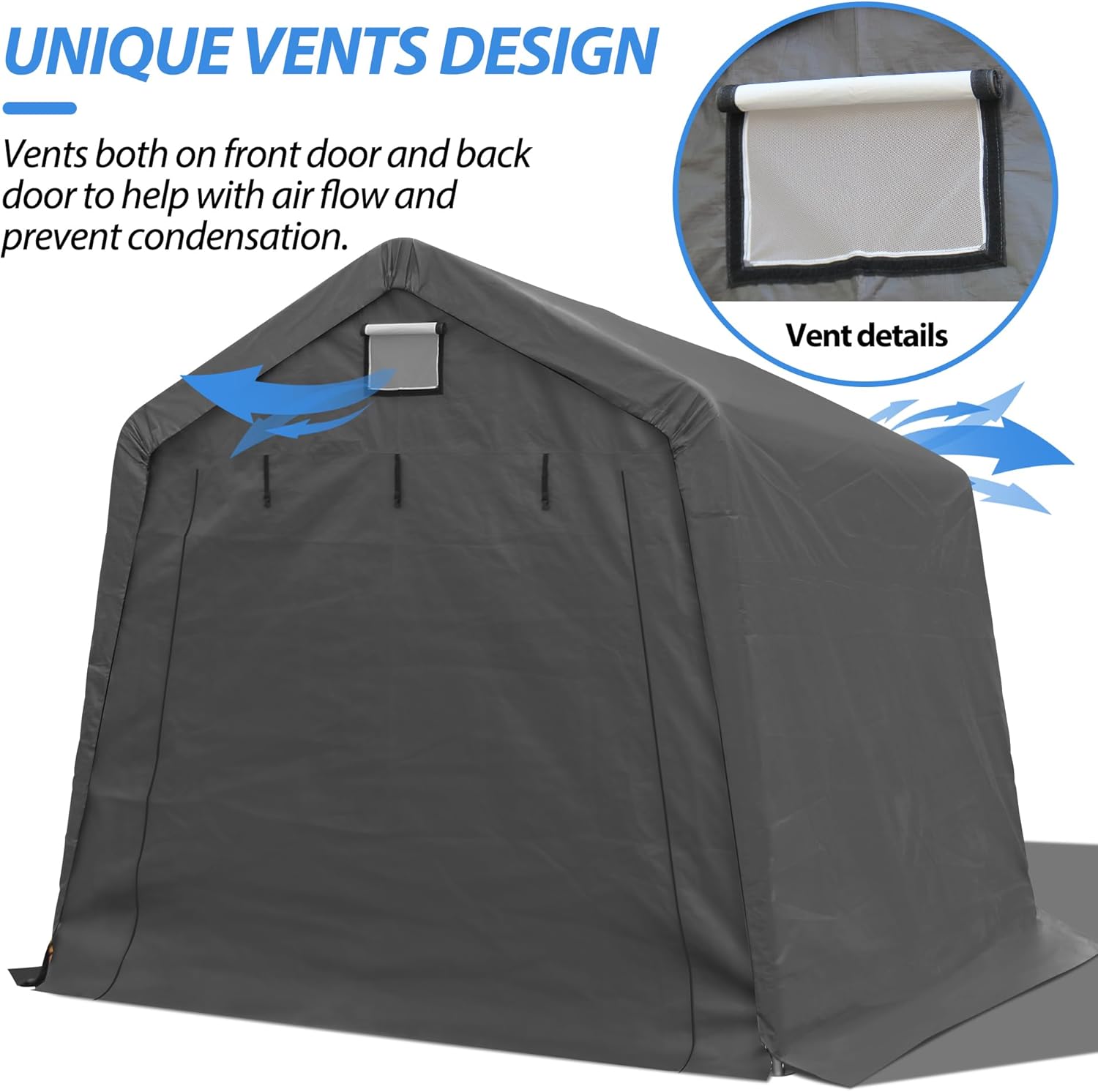 - VENTILATION DESIGN: Our storage shed equipped with removable zippered roll-up door that allow for easy access and ventilation when needed. And the top of the storage shed has a buckle for easy rolling up and securing.