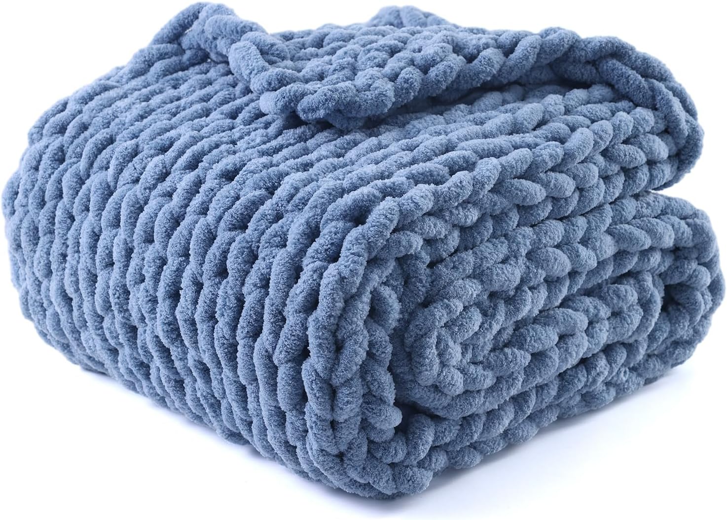 YnM Chunky Throw Blanket, Medium-Weight, Hand Knitted with Chenille Yarn, Skin Friendly, Ventilated and Breathable, Machine Washable, Home Décor Piece for Couch Sofa and Bed (Chambray Blue 80x87 Inch)
