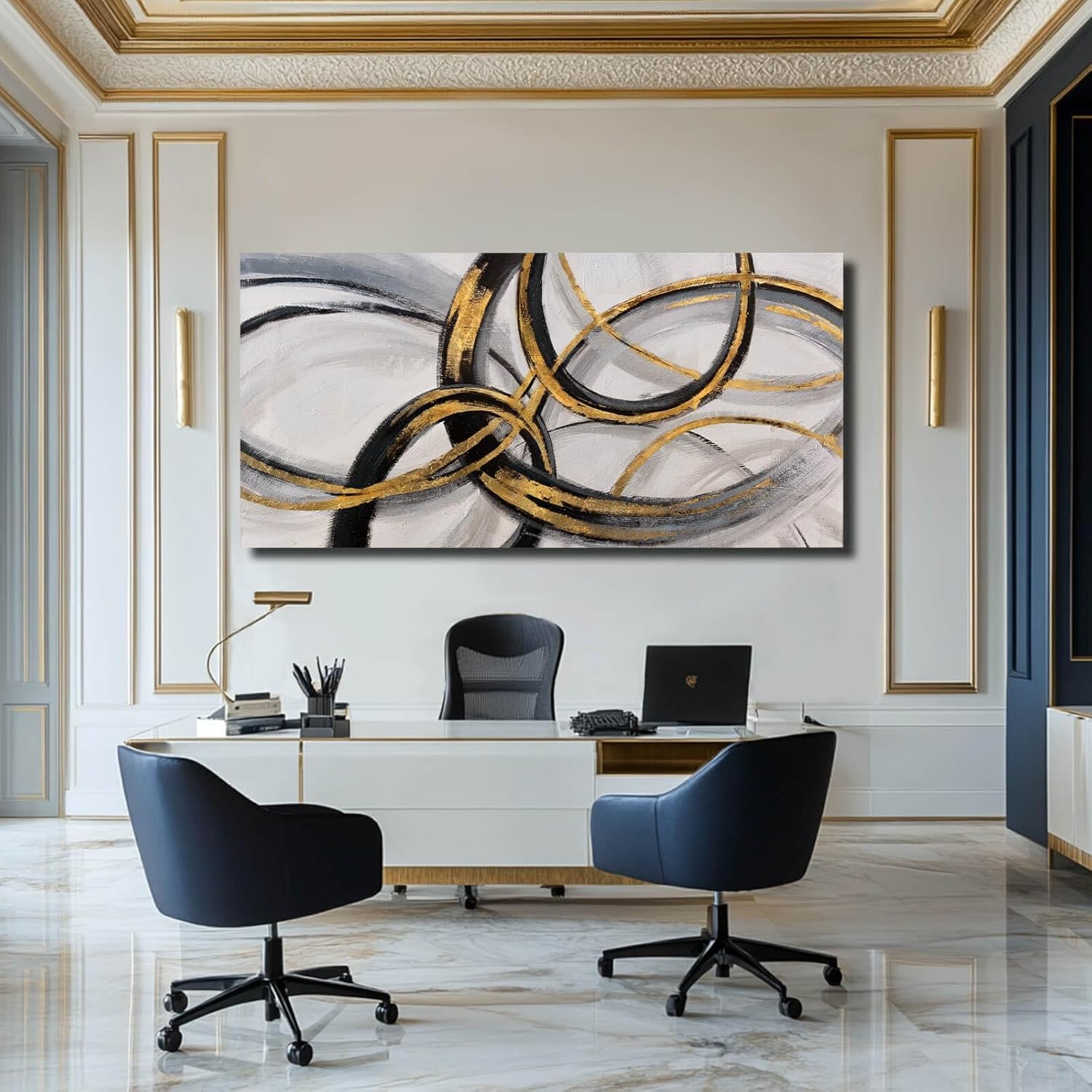 SOUGUAN Living Room Decor for Wall Abstract Wall Art 30x60in Black and Gold Wall Art Round Ring Wall Decoration for Bedroom Dining Room Home Office Ready to Hang