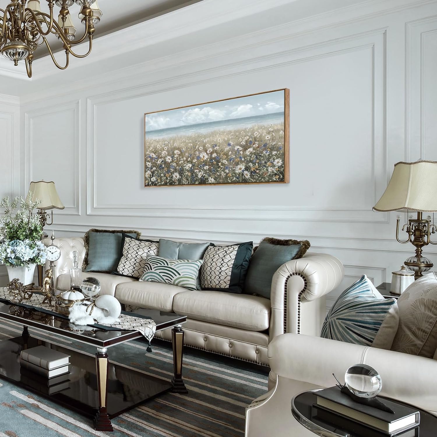 amatop Large Wall Art for Living Room Framed Boho Beach Coastal Floral Ocean Wall Picture Farmhouse Daisy Flower Sea Canvas Print Nautical Neutral Vintage Warm Artwork Home Bedroom Office Decor 48x24