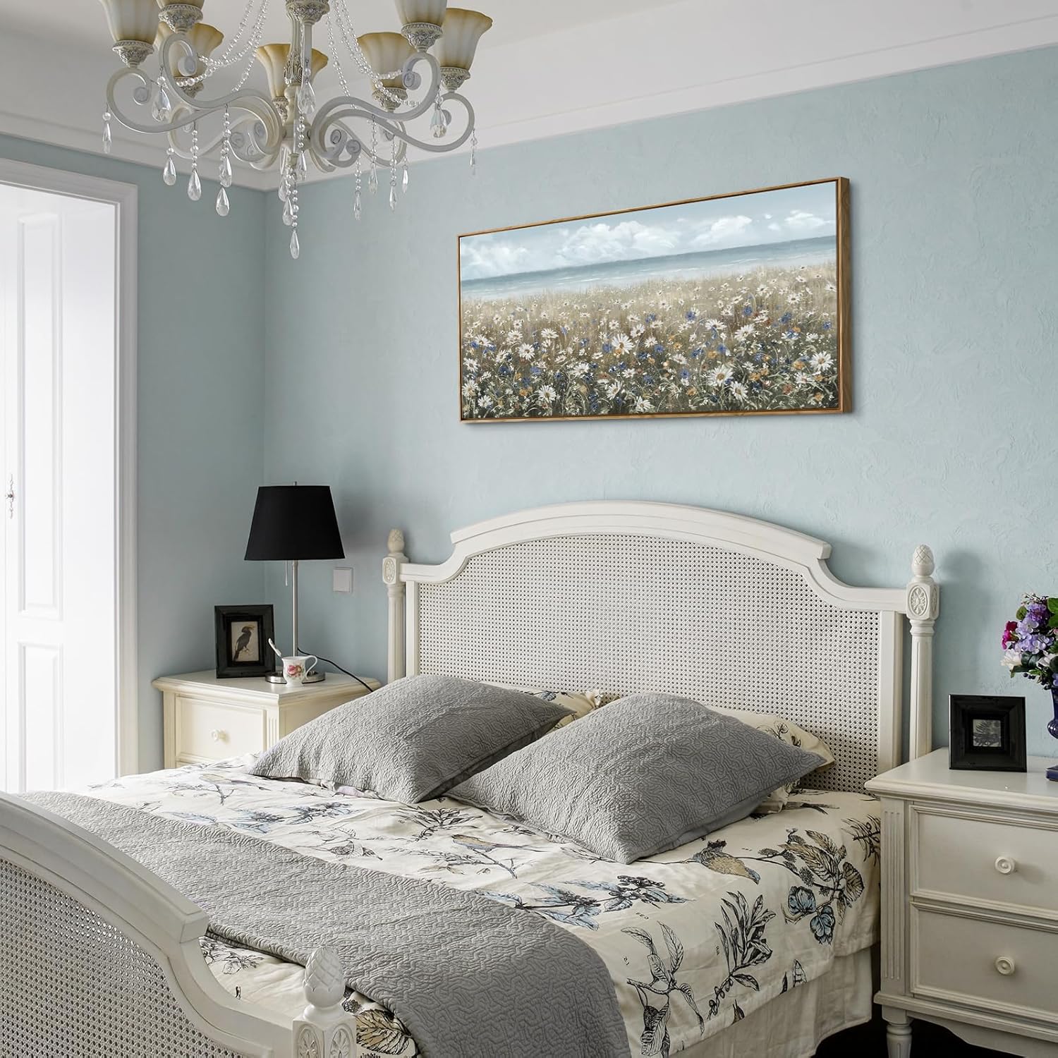 - ➤Bring a Beach Vibe to Your Space: This floral wall art depicts a seashore covered with newly blooming wildflowers Daisy. The upper half of the flower canvas wall art features a blue sky and a calm ocean in pale blue and gray tones for a fresh and breezy look. The lower half of the artwork is covered in a neutral palette of white, cream, and brown to complete this coastal farmhouse piece.