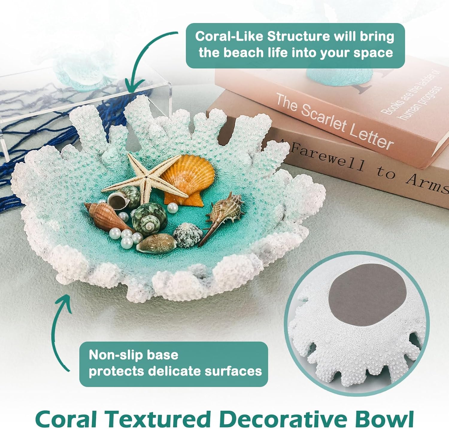 - [Beach coral decorations for home] This Turquoise coral decorative bowl is inspired by the serenity and allure of coastal living. With soothing hues and natural textures, it brings effortless beach charm to any home. Experience the feeling of being on a perpetual vacation at the seaside, all without exploiting our precious oceans. This coral decorative bowl perfect for modern coastal bowl decor and coastal decor for home