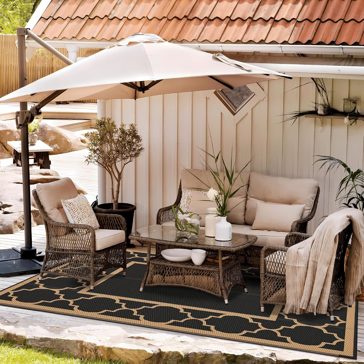 - Mood-Boosting Colors:Choose stain-resistant dark tones or go modern with blue & white or black. The reversible mat, with outdoor carpet qualities, is easy to clean and coordinates seamlessly with various decors. Whether placed on your deck or under a shaded umbrella, it serves as the perfect outdoor patio rug to match the style of your pamapic outdoor furniture.It’s an excellent piece for fall home decor or to use as a stylish outdoor rug fall accent
