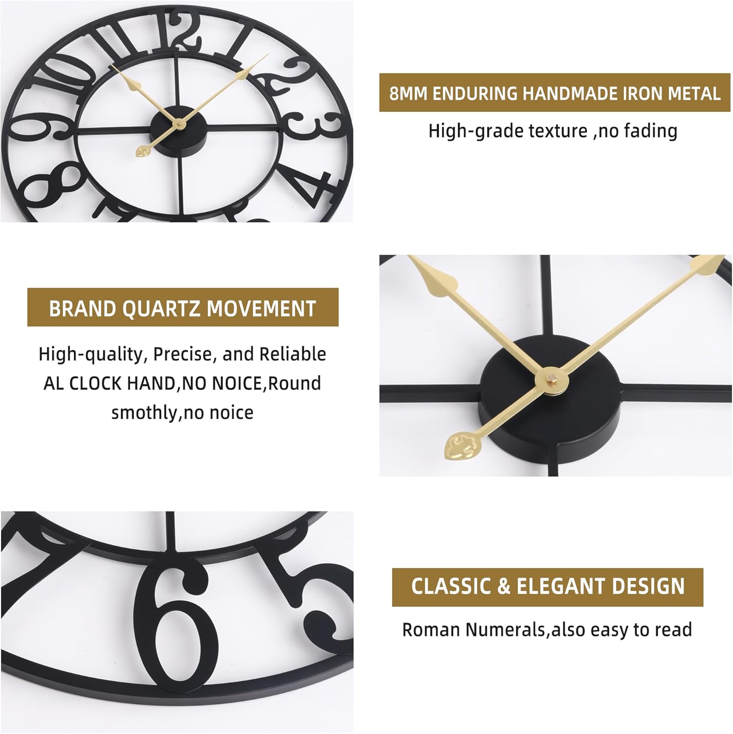 Large Wall Clock for Living Room Decor - 60cm/ 24 Inches Silent Non-Ticking Metal Wall Clocks Battery Operated, Vintage Decorative Modern Wall Clock for Bedroom, Office, Farmhouse Decor