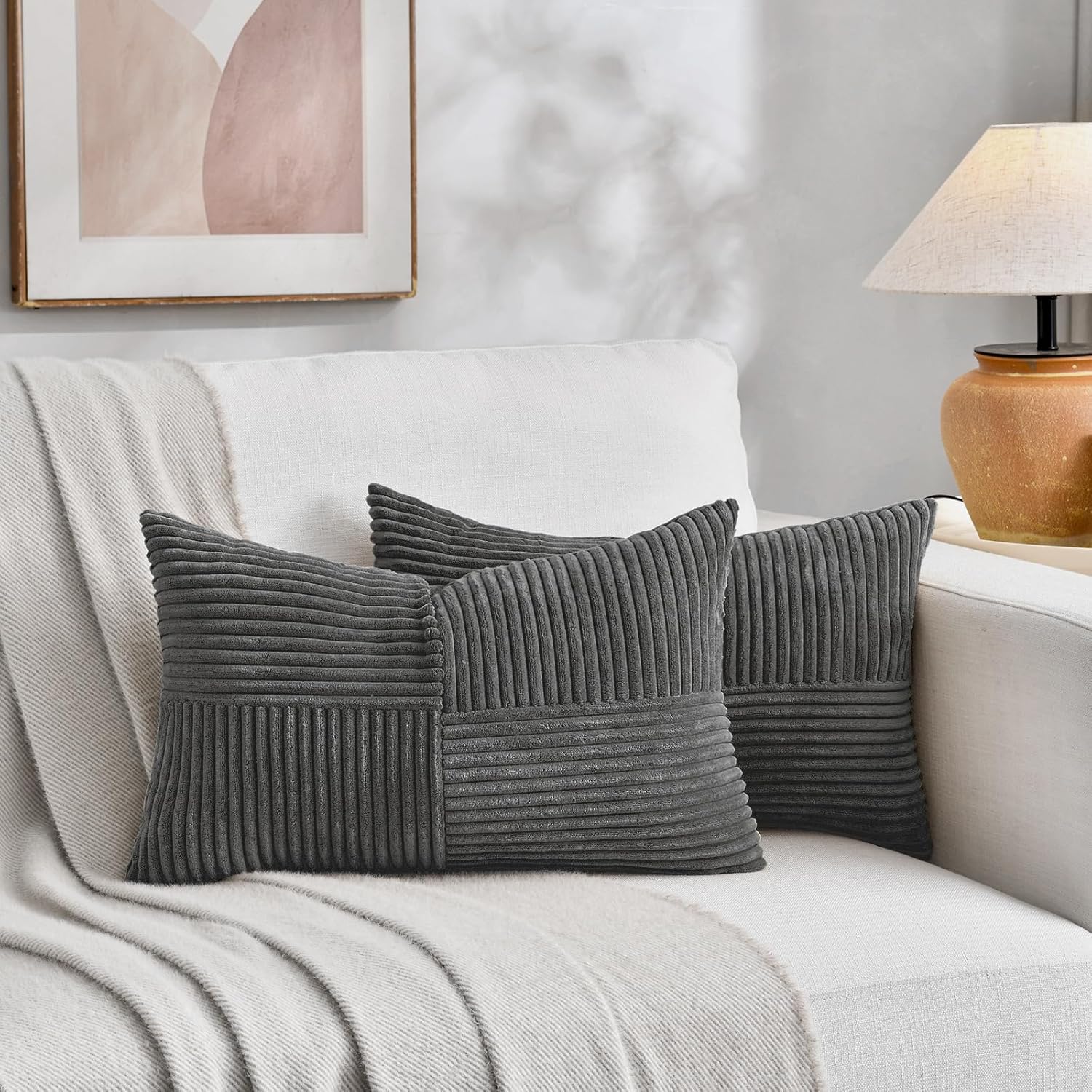 Fancy Homi 2 Packs Dark Gray Long Lumbar Decorative Throw Pillow Covers 16x24 Inch for Couch Bed Sofa, Rustic Farmhouse Boho Home Decor, Soft Striped Corduroy Rectangle Accent Cushion Case 40x60 cm