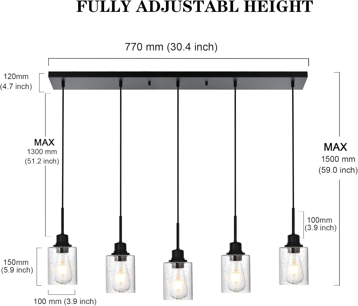 Black Chandelier 5 Light Dining Room Lighting Fixtures Hanging Linear Pendant Lights Industrial Modern Chandelier with Seeded Glass for Kitchen Island Living Room Bedroom Foyer Hall Entryway