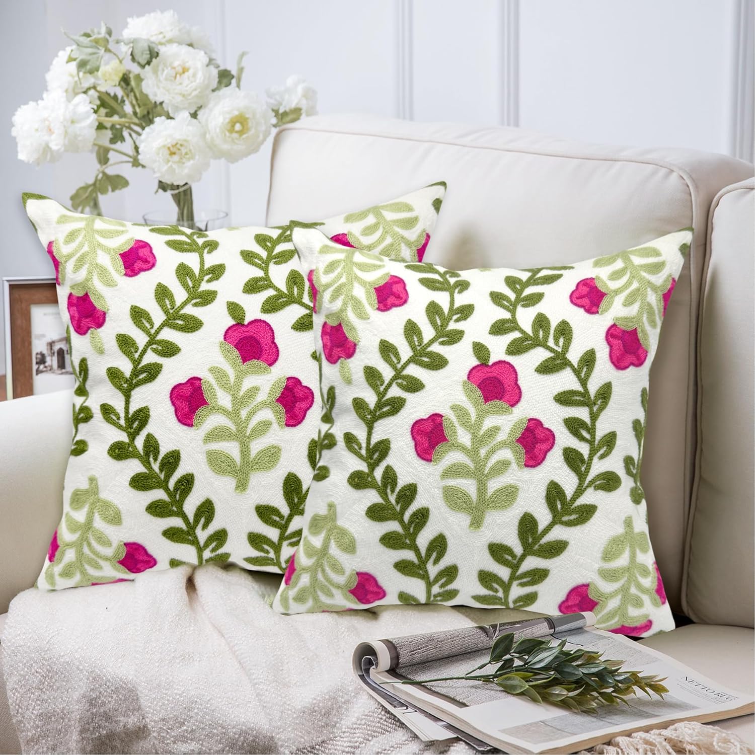 Alysheer Summer Decorative Throw Pillow Covers 18"x 18" Set of 2, Floral Embroidered Farmhouse Hot Pink Flowers Green Vine Patterned Cotton Canvas Cushion Case for Sofa Couch Bed Living Room Decor