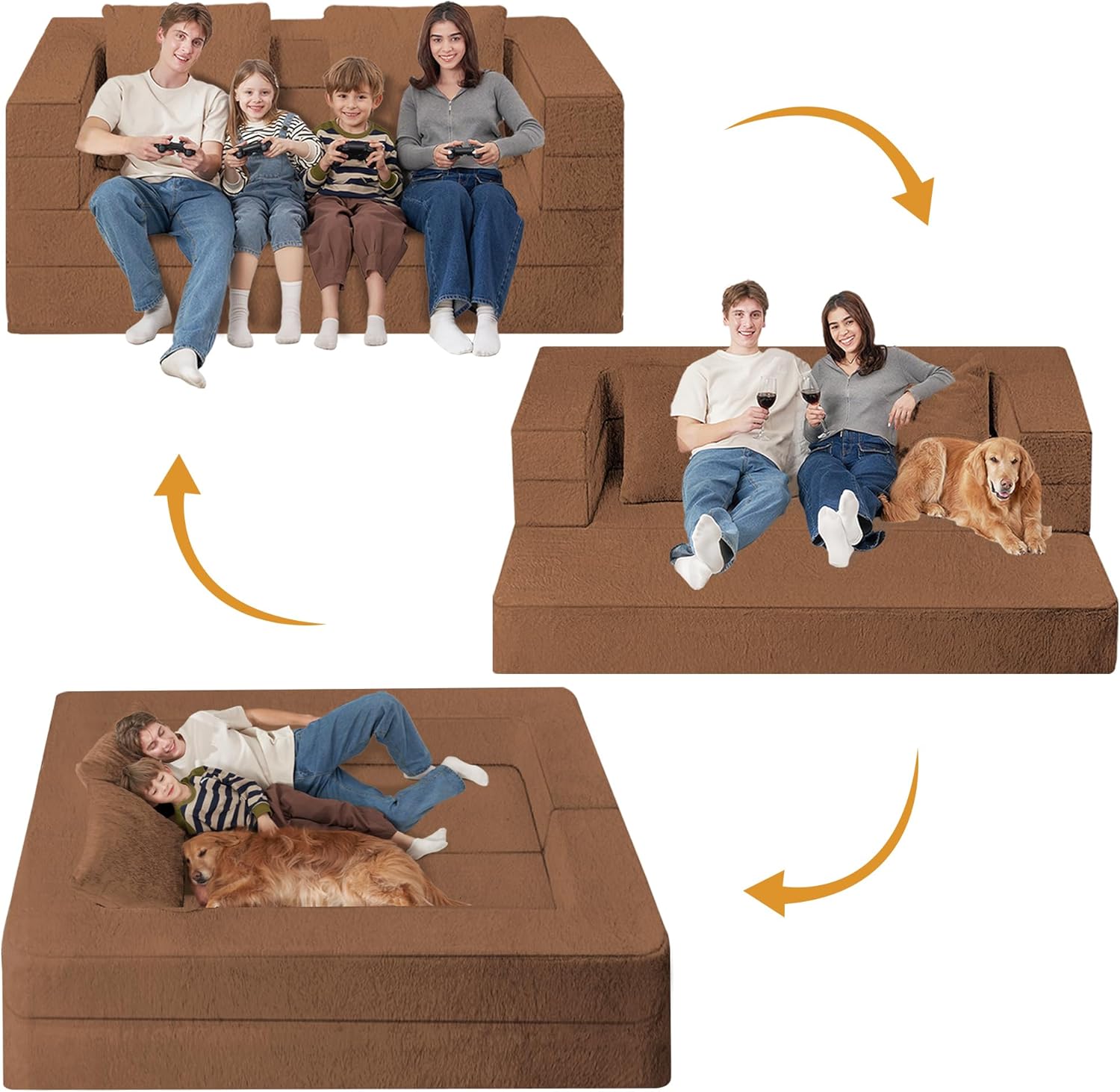 Folding Bean Bag Chair for Adults,3-in-1 Bean Bag Couch Faux Fur Floor Sofa Large Beanbag Convertible Bean Bag Sofa Bed with Pillow in Bedroom,Living Room,Apartment(Queen,Caramel)