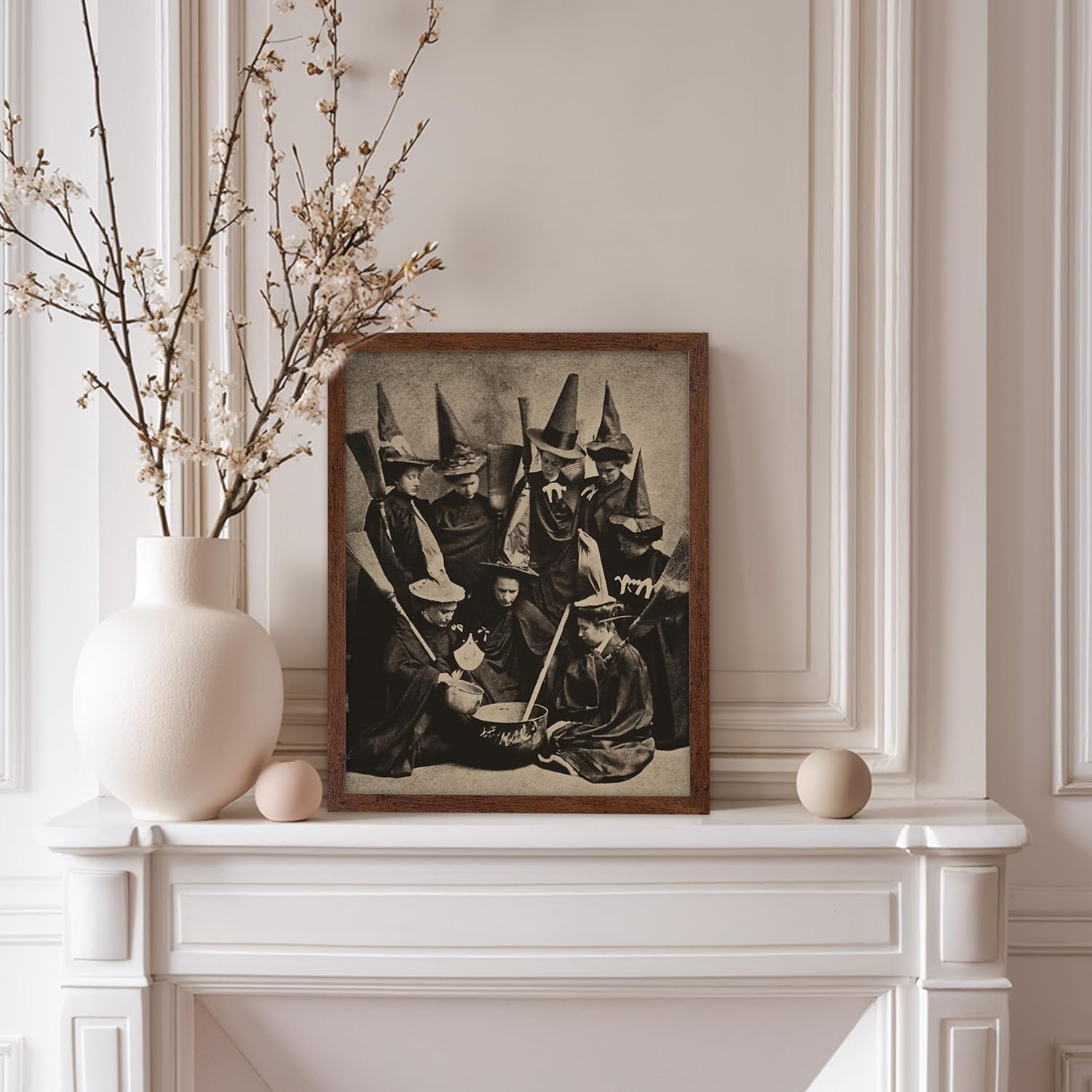 Poster Master Vintage Photograph Poster - Retro Halloween Print - Gift for Artist, Friend - Witches Cooking, Pointy Hats, Broomsticks, Black Magic - Wall Decor for Bedroom, 11x14 Brown Framed