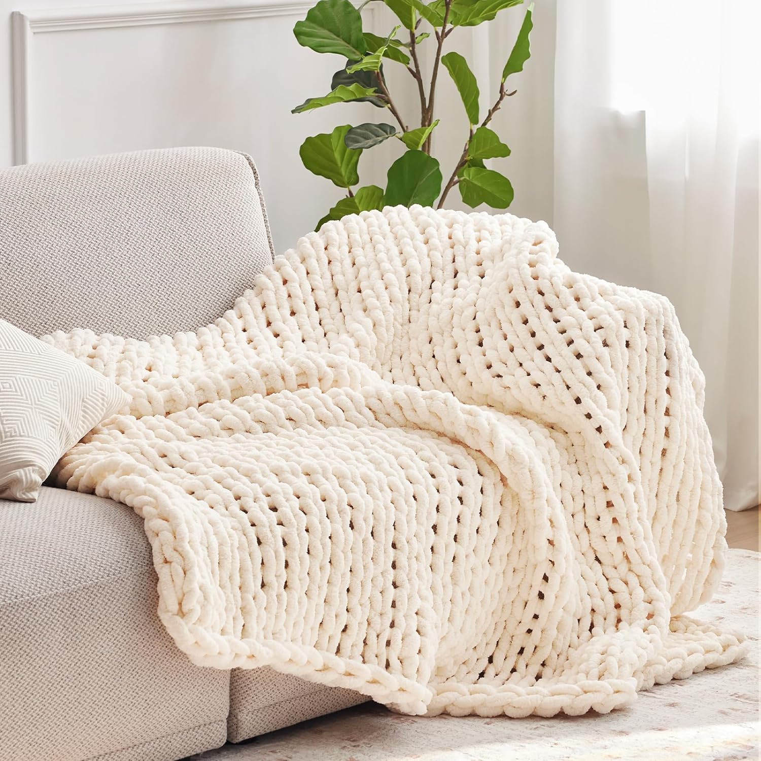 Chunky Knit Throw Blanket, 30''*40'' Knitted Throw Chenille Yarn for Bed Couch, Handmade Cream Crochet Big Thick Blanket, Machine Washable Cute Comfy Blanket for Home Decor