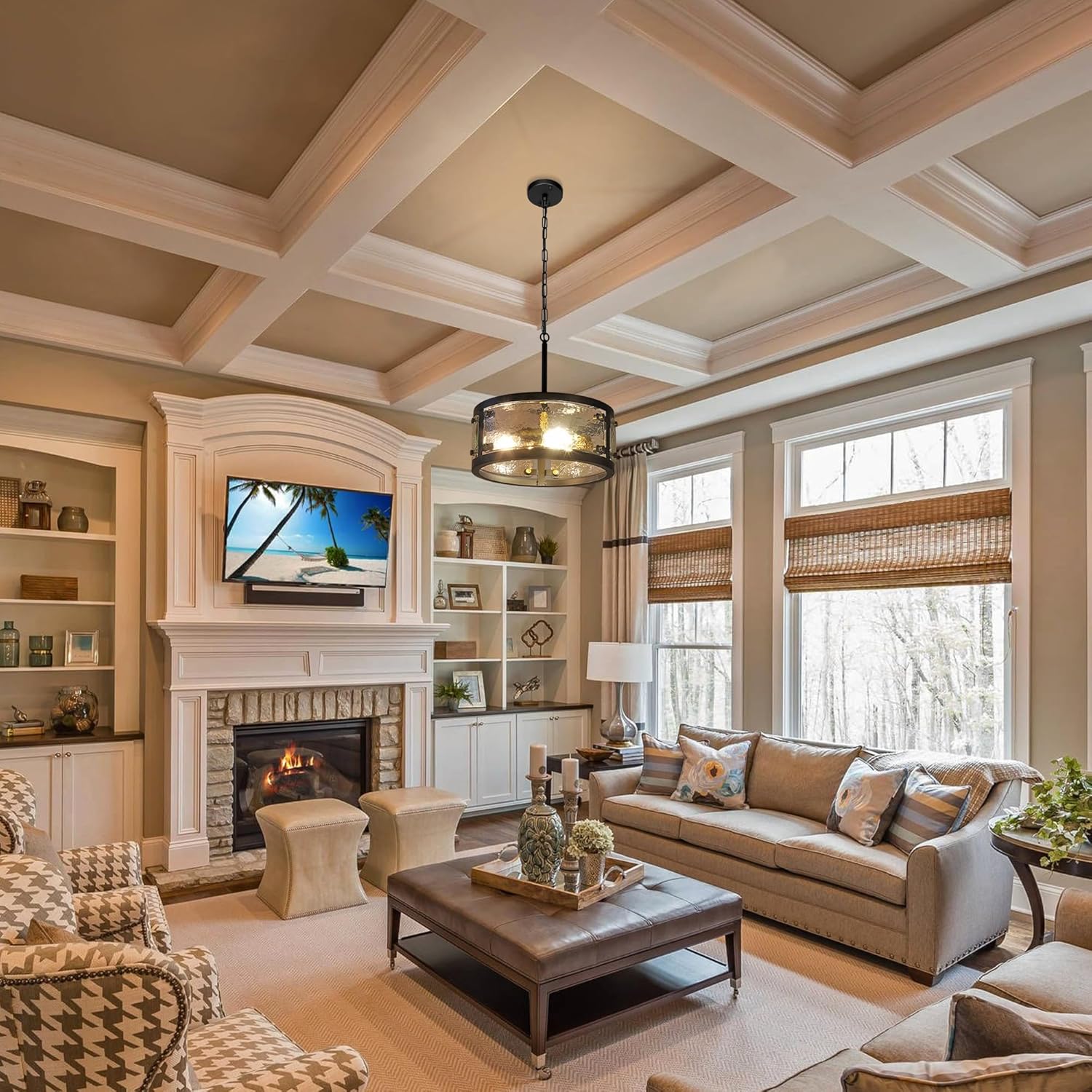 - Design: Drum pendant light is meticulously crafted by highly skilled craftsmen. The black metal frame is combined with clear waterglass to create a unique texture and depth. Gold accents add a touch of luxury, while the overall circular design provides an even and welcoming lighting effect. The clear waterglass will produce a unique light and shadow effect when the light penetrates, adding a unique charm to the interior.