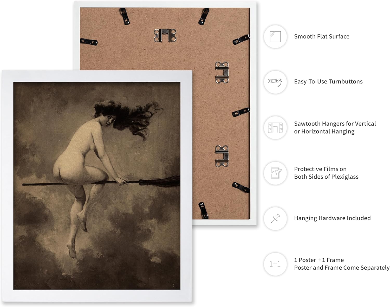 Poster Master Vintage Albert Joseph Penot Poster - Retro Halloween Print - Gift for Artist, Friend - Departure for the Sabbath, Naked Witch on Broom - Wall Decor for Bedroom, 16x20 White Framed