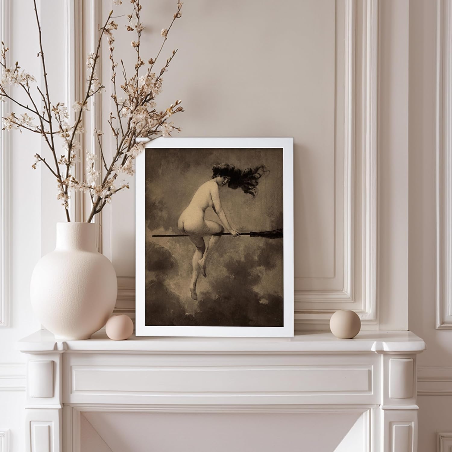 Poster Master Vintage Albert Joseph Penot Poster - Retro Halloween Print - Gift for Artist, Friend - Departure for the Sabbath, Naked Witch on Broom - Wall Decor for Bedroom, 8x10 White Framed