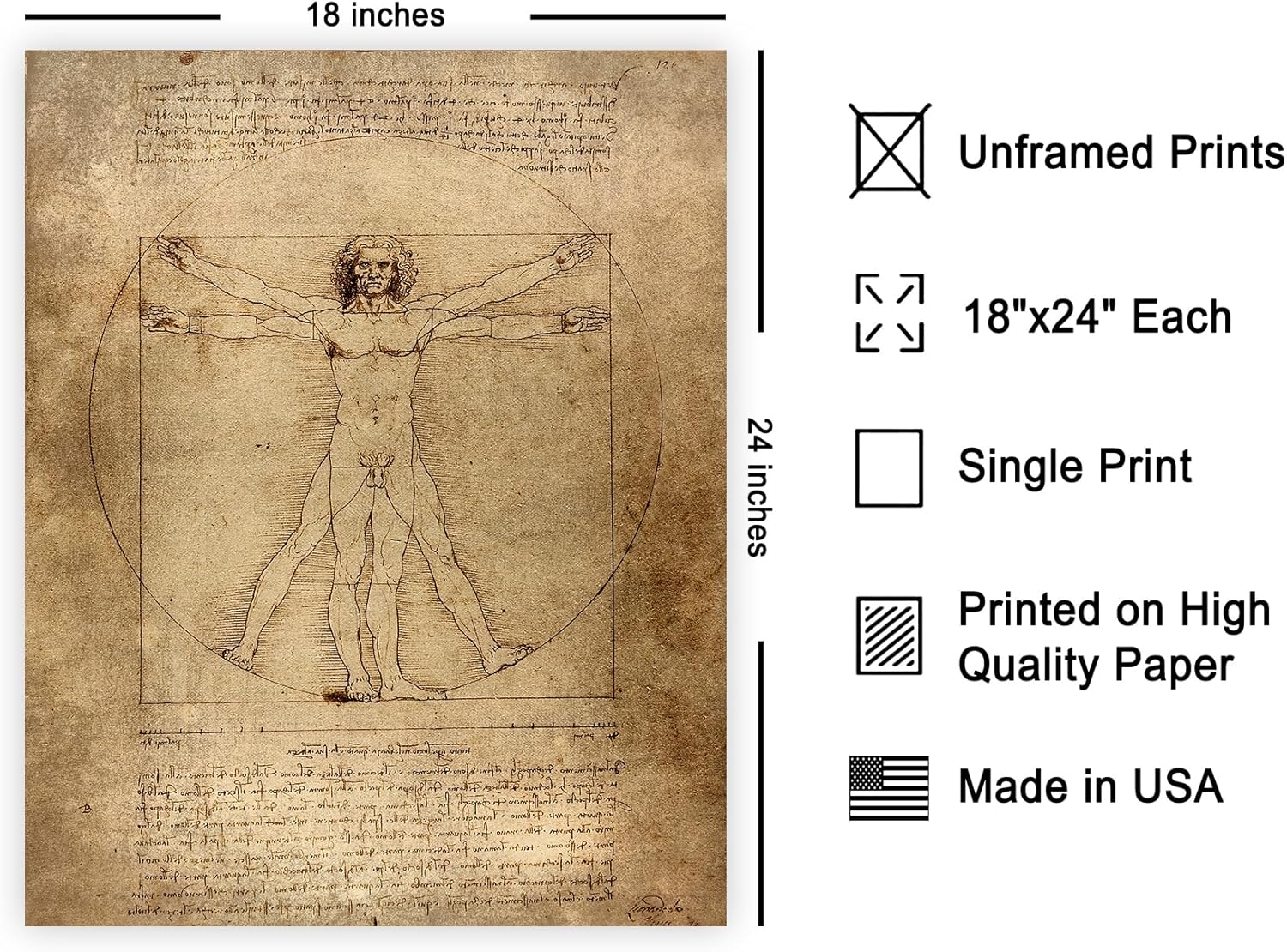 Poster Master Classic Leonardo Da Vinci Poster - Vintage Renaissance Print - Gift for Artist, Friend - Vitruvian Man, Proportion, Symmetry, Human Body - Wall Decor for Office, 18x24 Unframed Wall Art