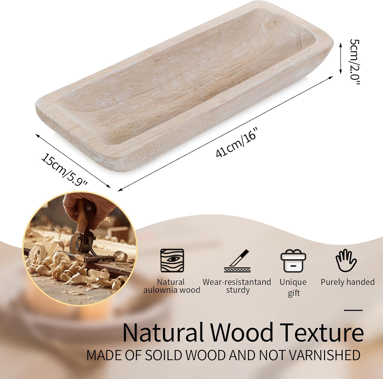 - Dimensions: The long wooden bowl measures 16" x 5.9" x 2"(L*W*H) approximately. The inside depth of the bowl decor is shallow, but is the right depth to hold bowl fillers for home decor