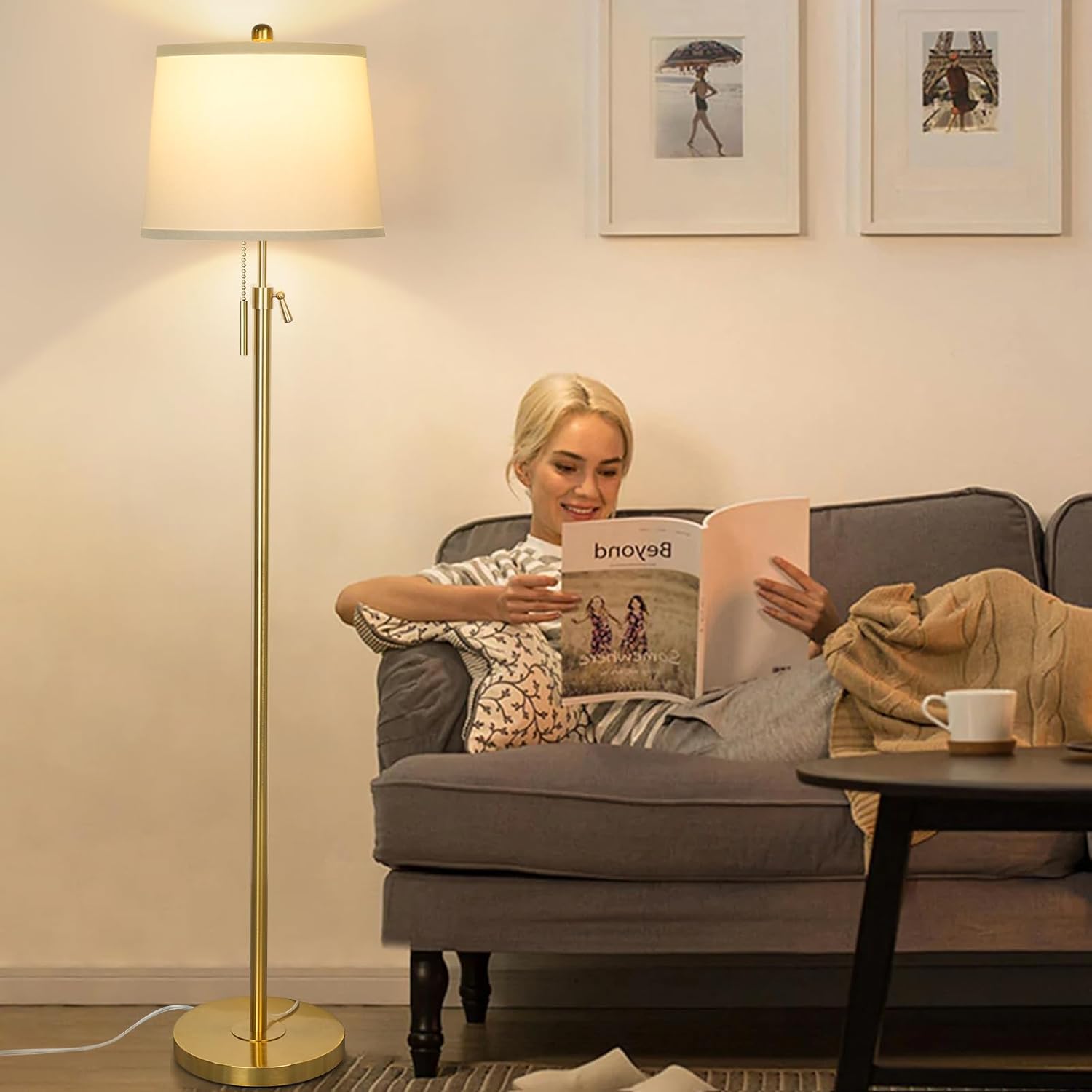 Gold Floor Lamp for Living Room, Tall Standing Lamp 55-65" Adjustable Modern Brass Floor Lamps for Bedroom Reading Office Kids 3 Color Lights Corner Night Stand (9W LED Bulb, White Shade)