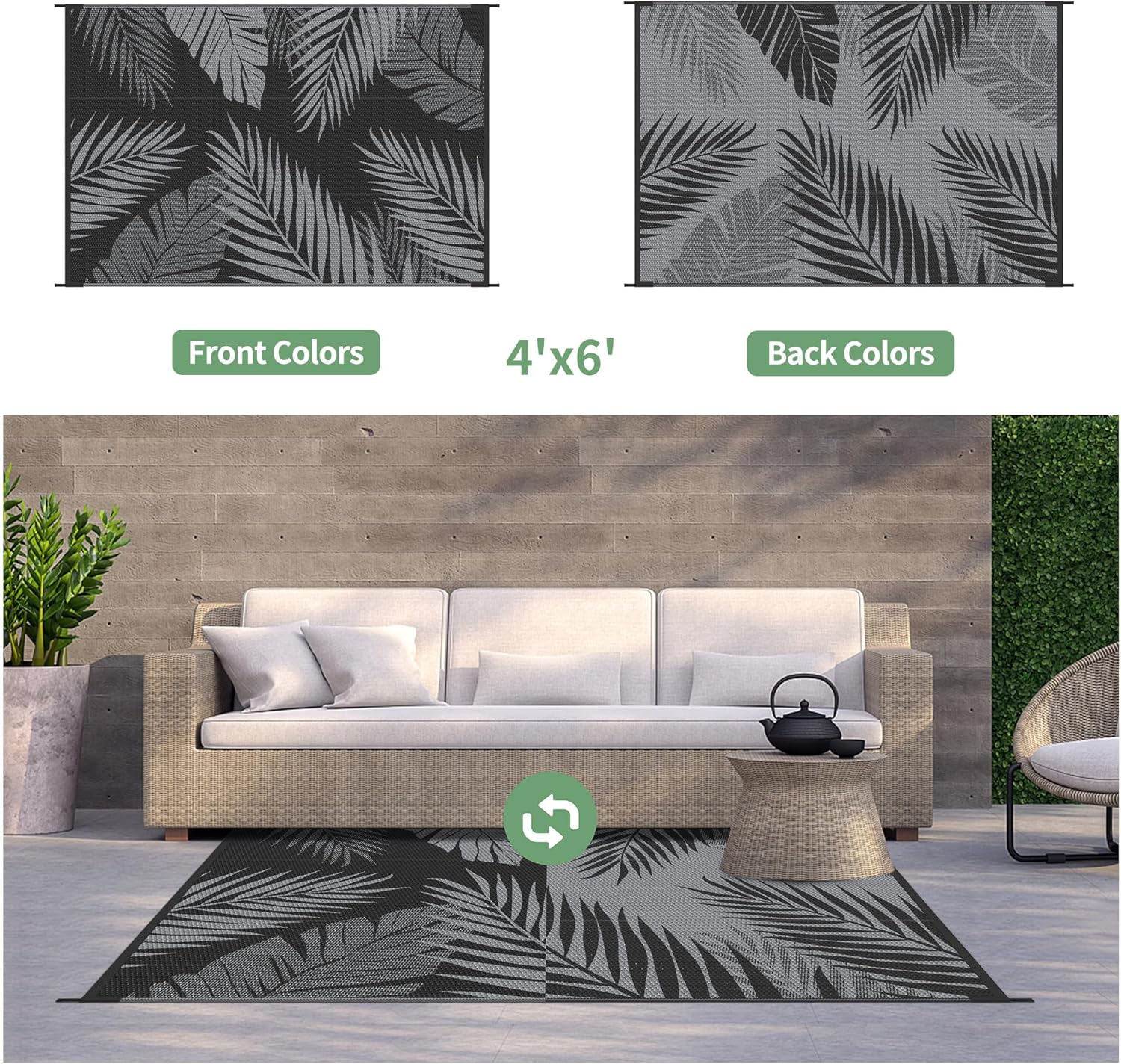 - Palm Leaf Design & Double-Sided Pattern: GENIMO reversible fall outdoor rug is designed with a double-sided pattern, completing the unique layout of multiple palm leaves. The 2 shades of black and grey achieve the ultimate fusion. Either side can blend perfectly with nature and look very full and comfortable, making it a versatile piece for fall decor
