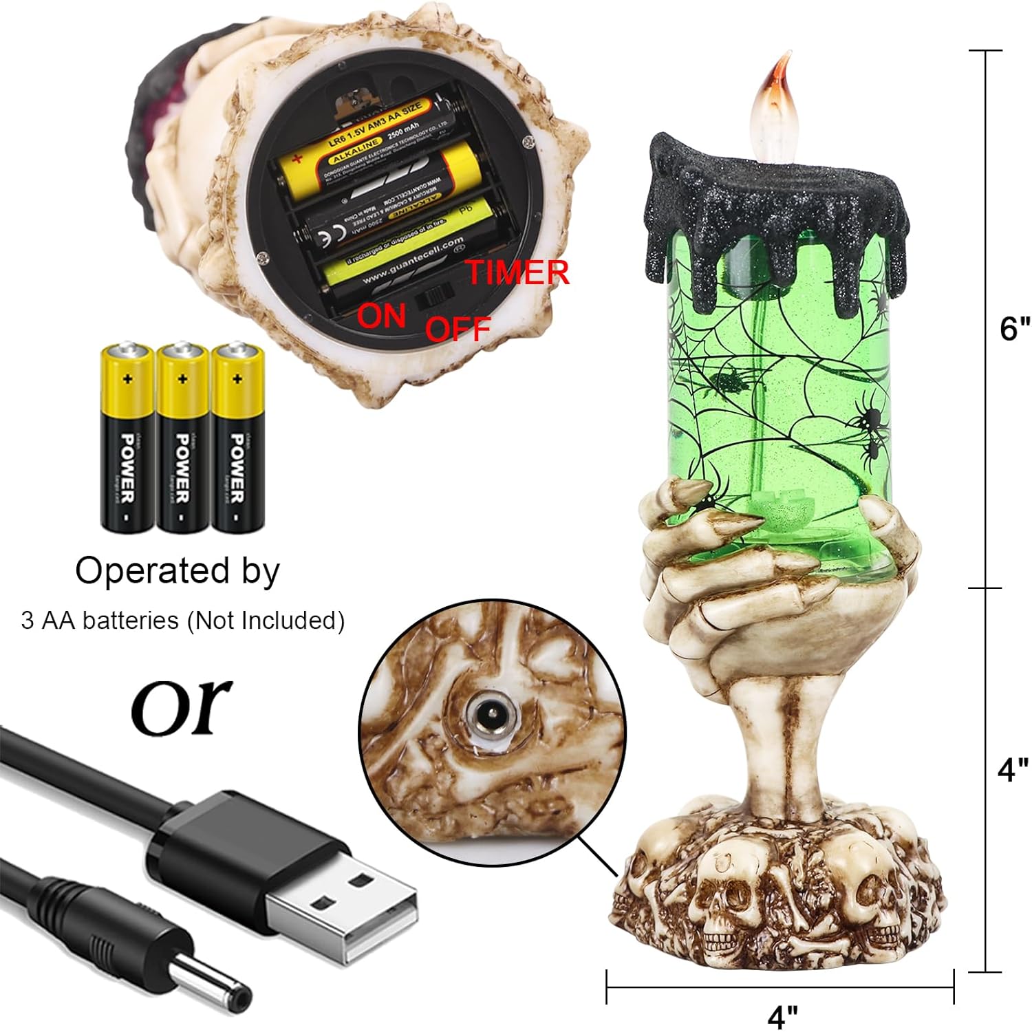 - [SNOW GLOBE CANDLES]: Vivid skeleton hand candle holder grab the lighted snow globe lamp, glittering spiders and spinning water with yellow lights create a spooky horror atmosphere. Decorate your Halloween in a different way this year, water glittering spinning snow globe candle will light up your whole Halloween season.