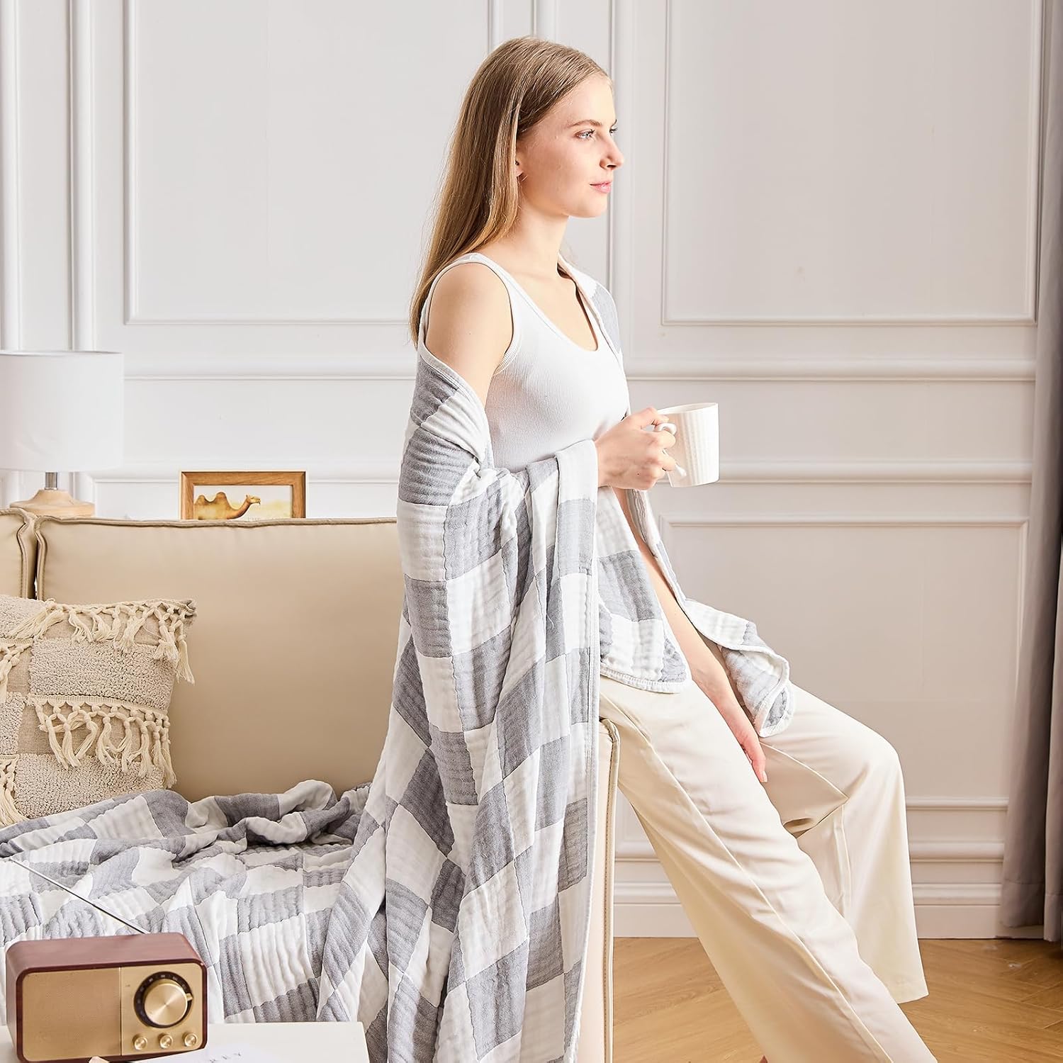 EMME Checkered Throw Blanket Cotton for Couch Soft Muslin Blankets 50"x60" Lightweight Breathable Cooling Soft All Season Gauze, Light Grey