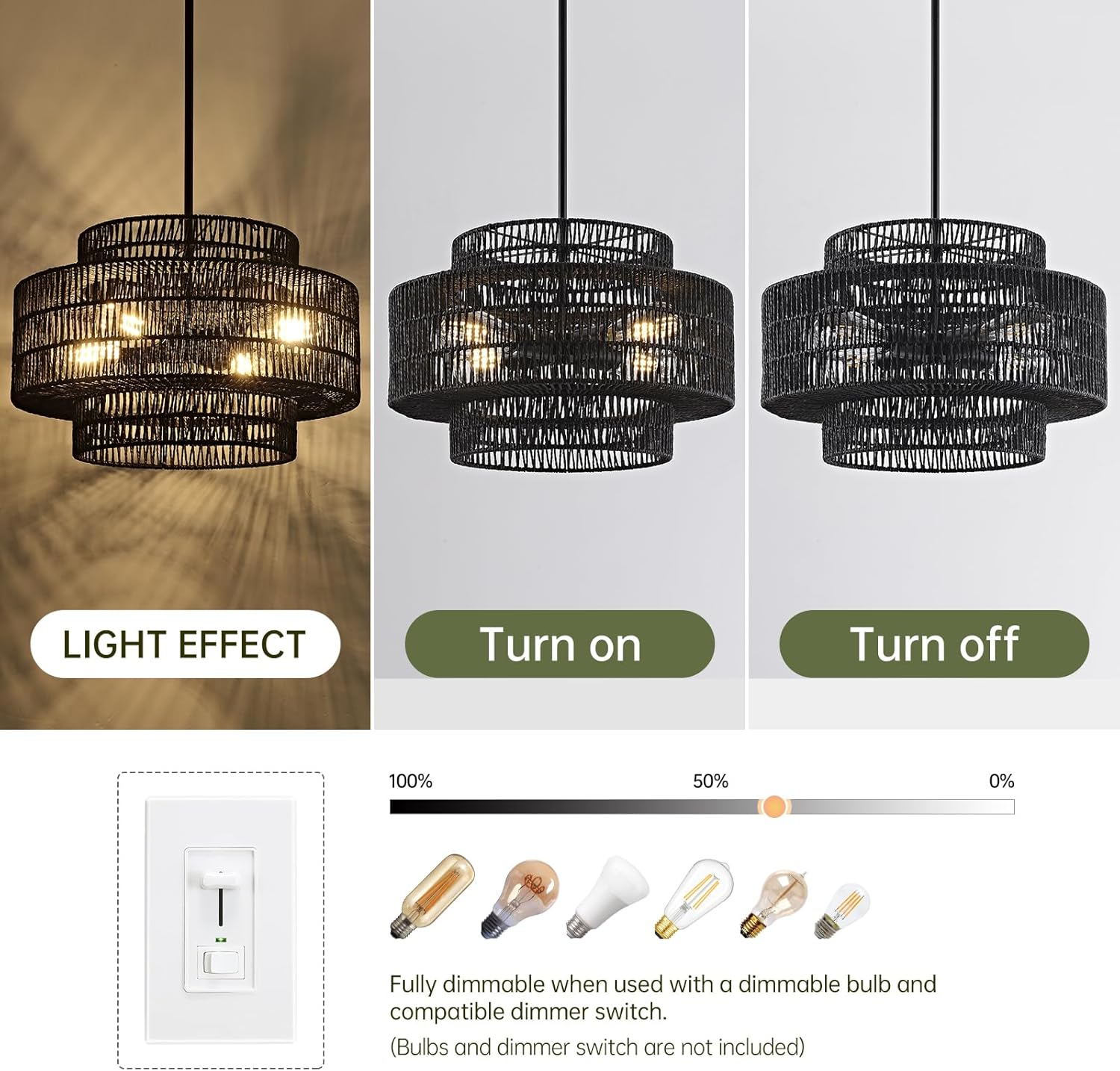 - [BOHO CHIC] This Boho Rattan Chandelier is handwoven by skilled artisans. The light gently filters through the woven rattan, casting beautiful shadows and adding a touch of natural texture to your decor. Complemented by an exquisite black-plated cylinder lamp rod and drum, it adds a touch of luxury to your space.