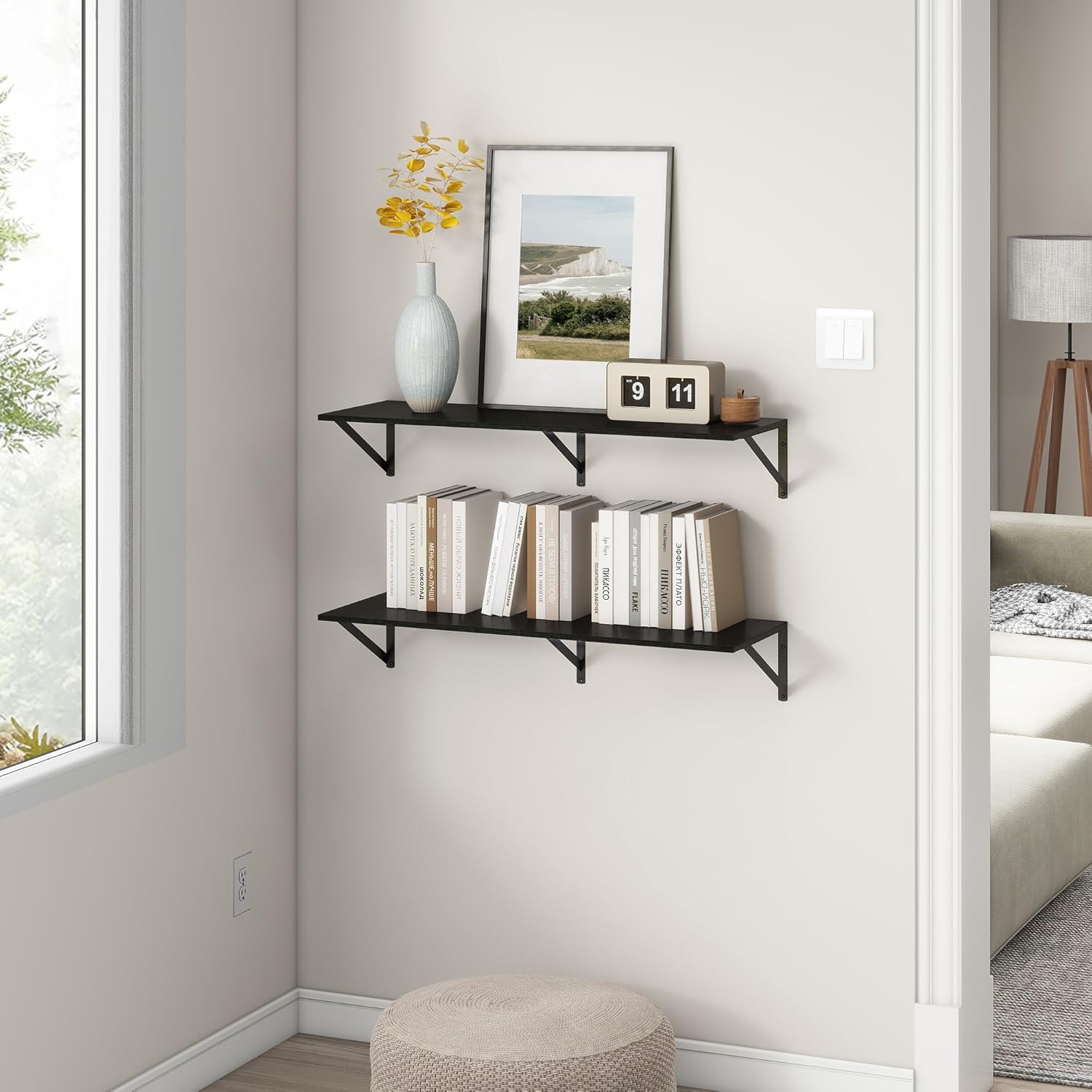 - 【FARMHOUSE RUSTIC WALL SHELF】These floating shelves are made of premium engineered wood board and visible triangular bracket. The rustic wooden grain surface add character and warmth to any modern or traditional interior with these deep floating shelves, contrast shelves at staggering heights on the wall or mount side-by-side or in the corner for a clean streamlined look.