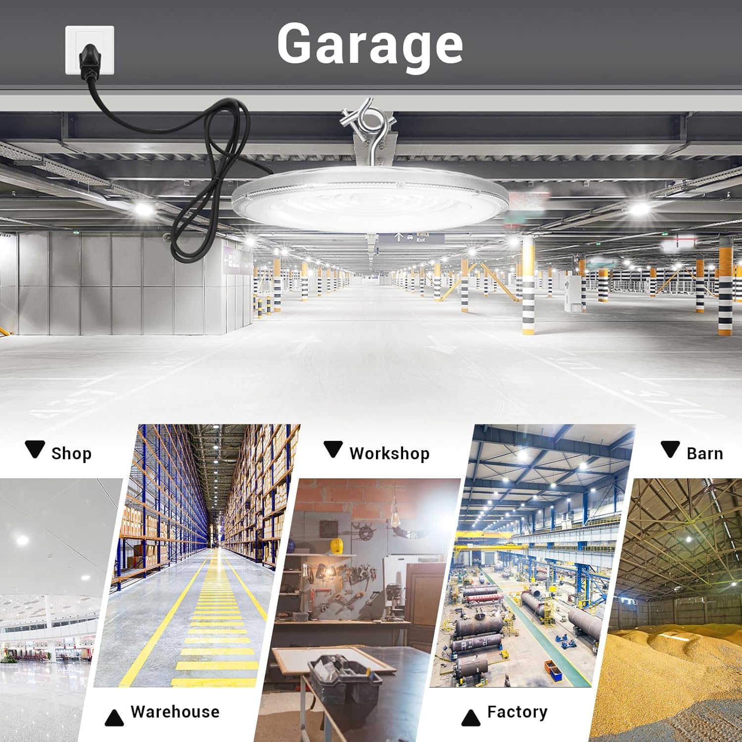 - 【Easy & Quick Installation】This UFO Led High Bay Light can be easily installed in seconds with the 5FT power cord provided and the built-in hook. It comes with US plug with which you can plug to the power directly, safe and secure for extremely easy installation. Ideal indoor lighting,This LED highbay light can work under power supply of AC 120V