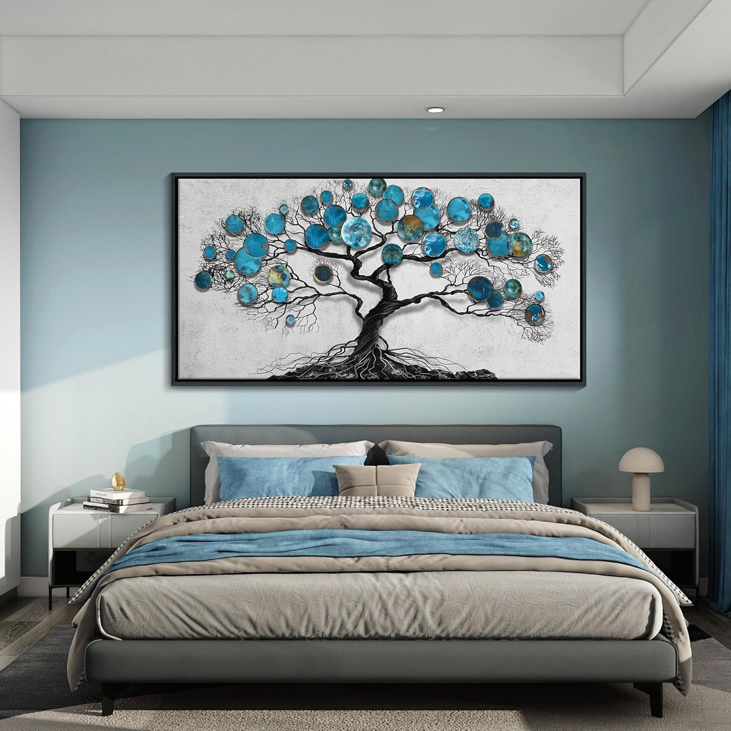 - Large Bedroom Teal Wall Art: This living room wall art features a tenacious tree of life design, gray background with black branches blue leaves concept to enhance the beauty of your home, become an excellent mural pictures.