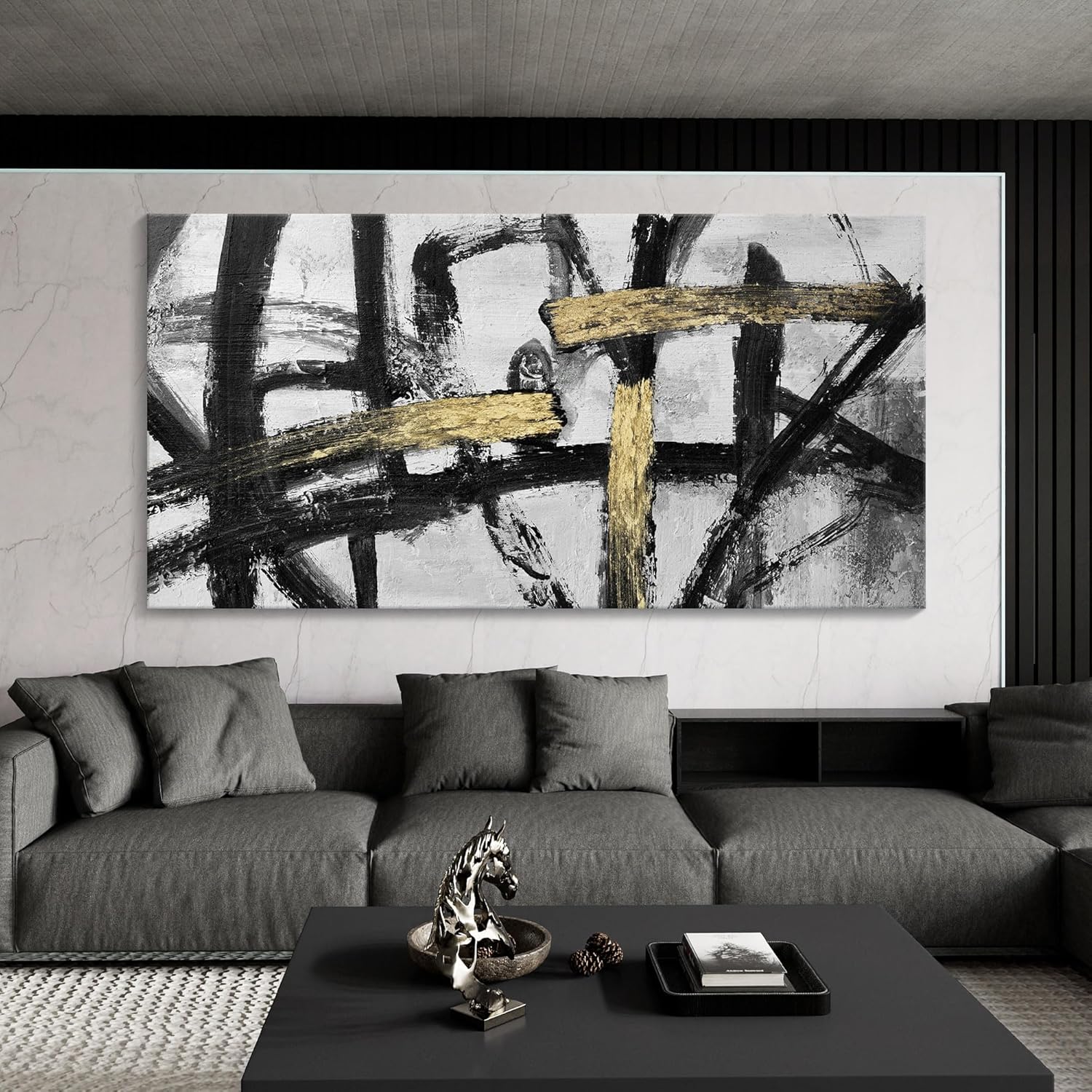 - Modern Abstract Wall Art: This 29X58 in wall art is dominated by black and gray tones,creating a deep and mysterious atmosphere.These tones of wall decor living room not only make the picture more layered,but also lead us into a world full of creativity and unlimited imagination.