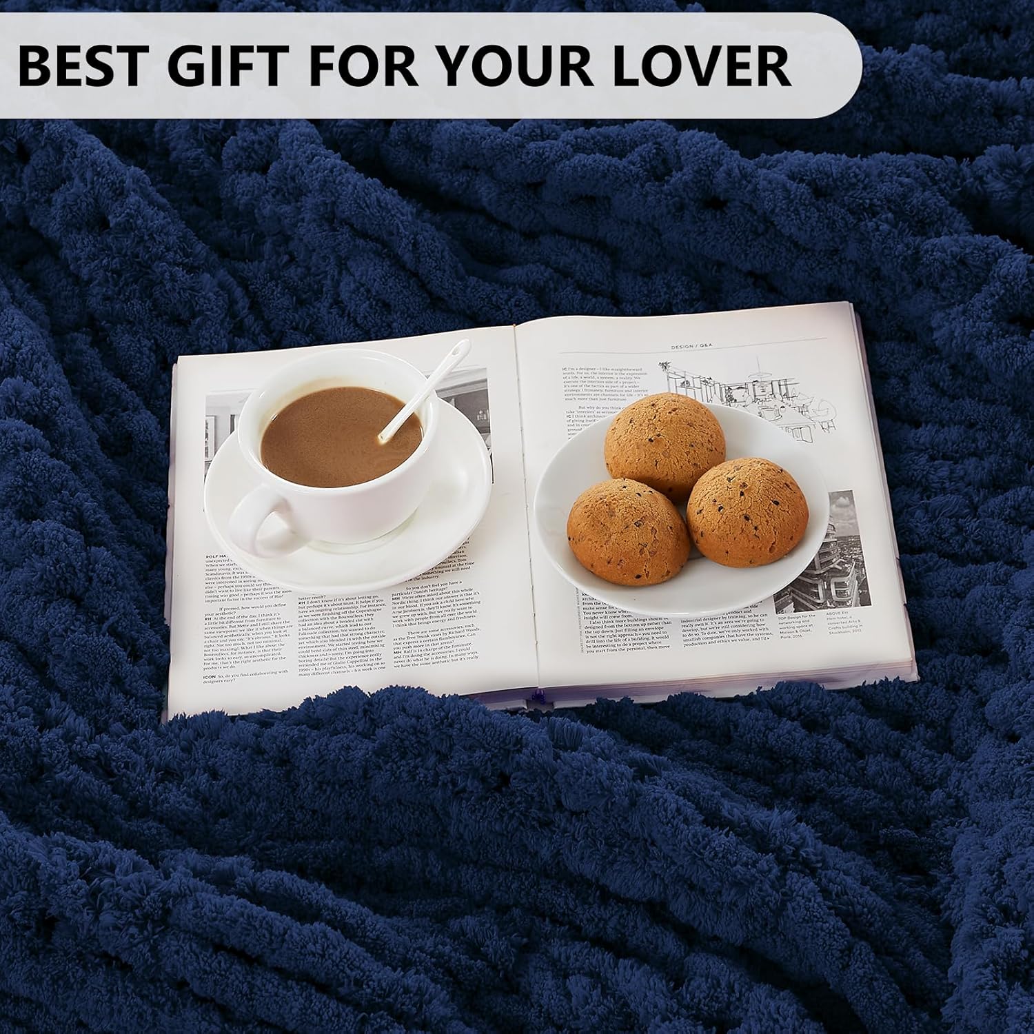L'AGRATY Chunky Knit Blanket Throw - Soft Chunky Throw Blanket 50x60: 100% Hand Kintted Chenile Crochet Throw Blanket for Couch - Large Cable Knit Chunky Blanket for Home Decor(Dark Blue)