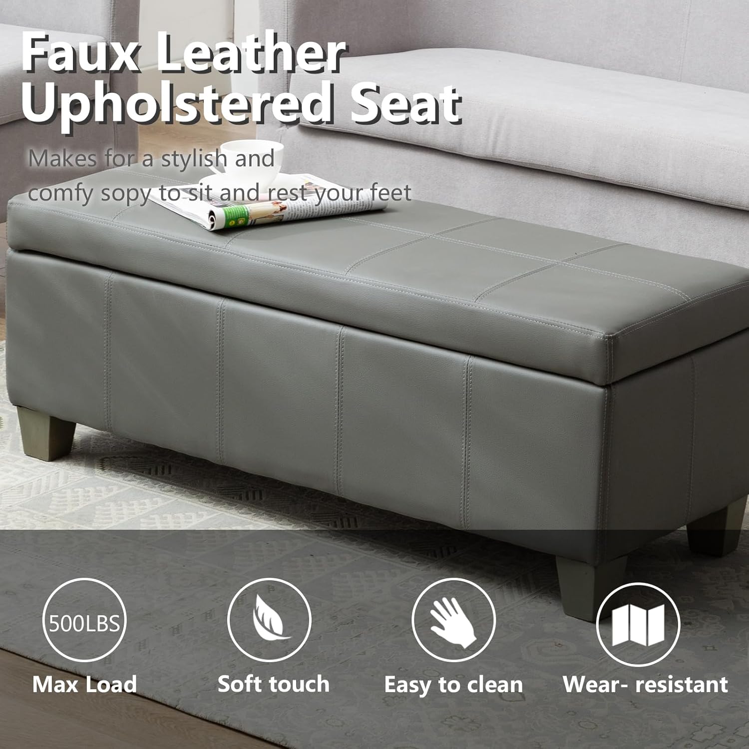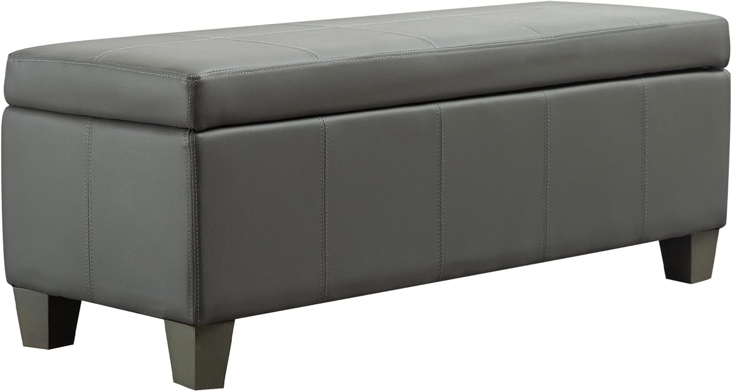 Grey Faux Leather Ottoman with Storage, Rectangular Extra Long Storage Bench for Bedroom and Living Room