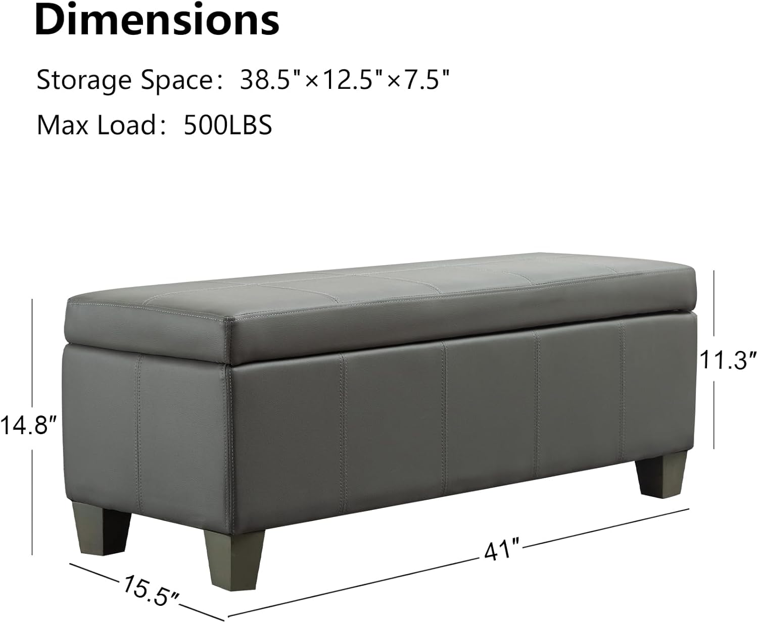 - OVERALL DEMENSION: The overall size of UDAX faux leather ottoman is 41‘*15.5’*14.8‘ and the inside storage dimension is 38.5’*12.5‘*7.5’. Our storage bench is wide enough to sit cozily and large enough to store your blanket, clothes, children's toys, and so on. It has plenty of space to help you organize every corner of your home.