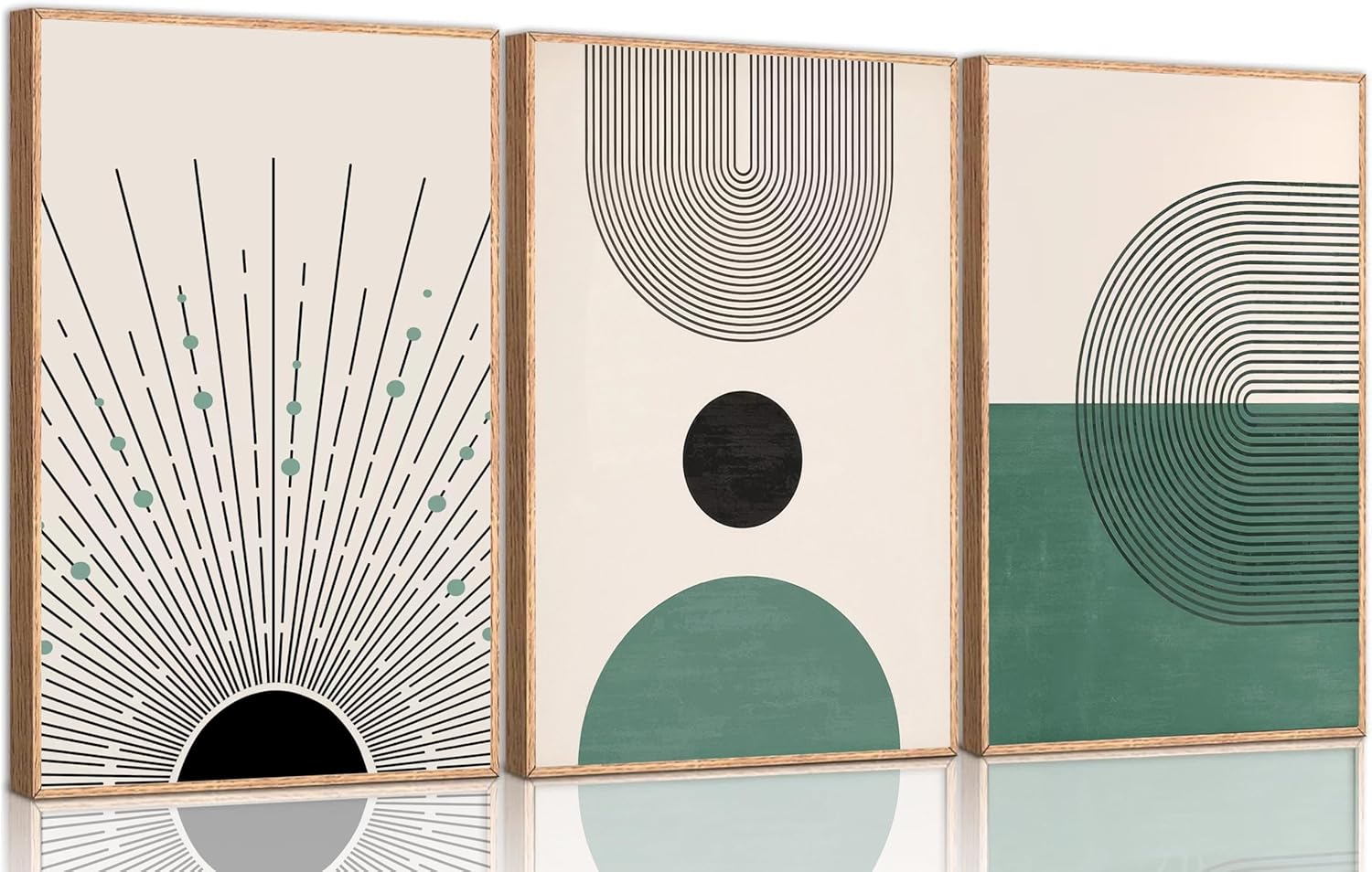3 Pcs Sage Green Boho Canvas Wall Art Modern Abstract Minimalist Neutral Bohemian Sun Geometric Line Painting Picture Wall Decor Poster Print Artwork for Living Room Bedroom Home Decoration Unframed