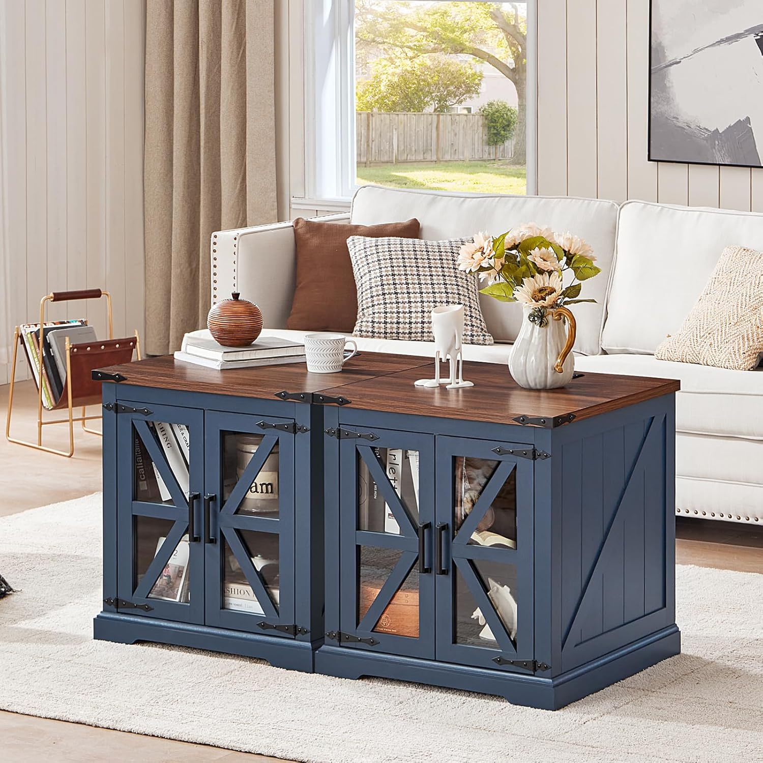 - 🏡[Functional Art Piece]The oversized end tables living room storage design provides convenient storage for your living space. The built-in shelves can be adjusted to 3 different heights as per your needs, accommodating an abundance of books, blankets, or coffee mugs. The glass barn-style doors blend traditional farmhouse aesthetics with a modern sensibility, transforming this piece into a more contemporary farmhouse night stand, coffee table, bedside table, or side-of-sofa art.