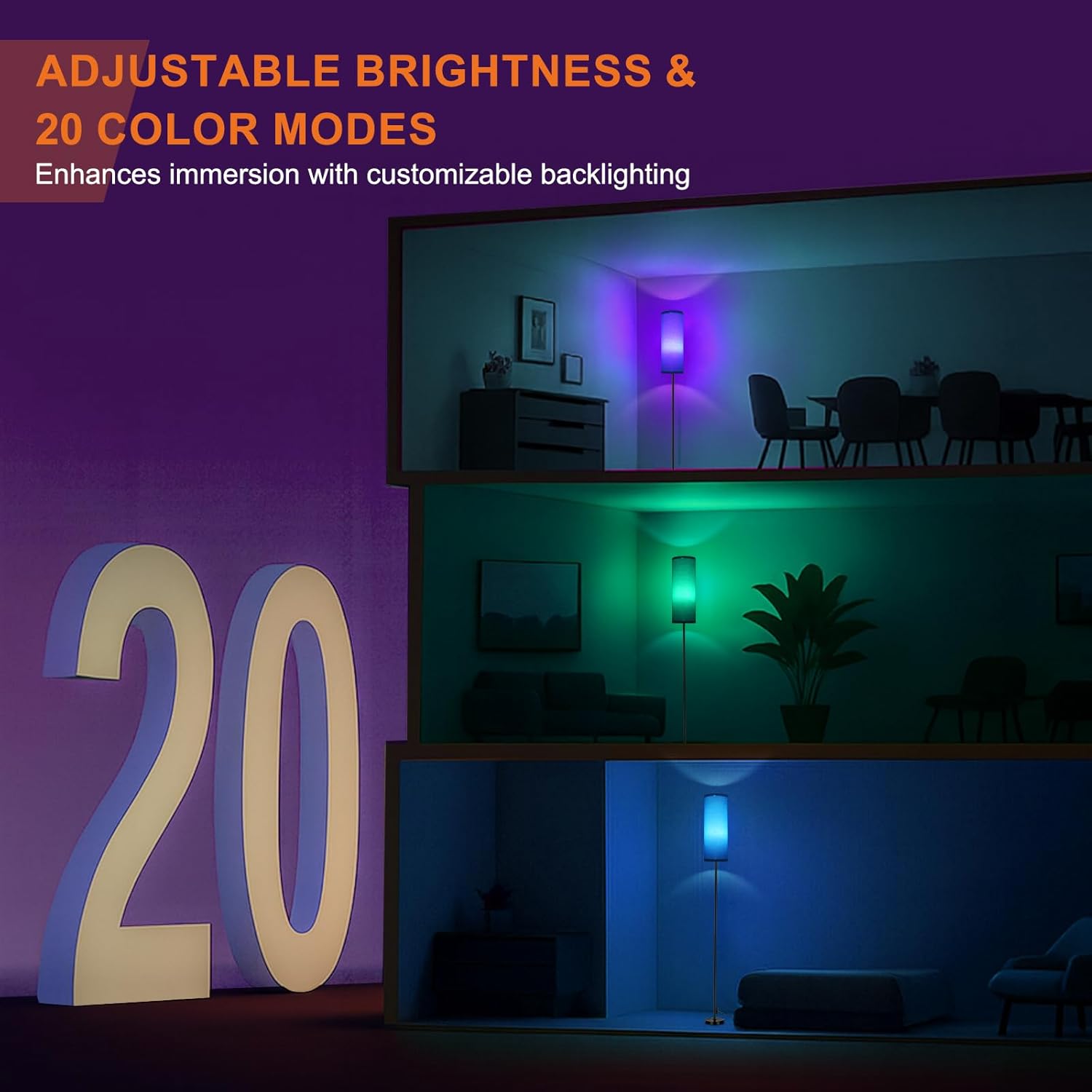 - 【Various use scenarios】This floor lamp is perfect for creating a relaxing atmosphere for various activities. Whether you're hosting a get-together, enjoying a movie night, gaming, or general Background Lamp, you can set the mood just right. The ability to customize the color and brightness allows you to tailor the lighting to fit any occasion, making it a versatile addition to any room.