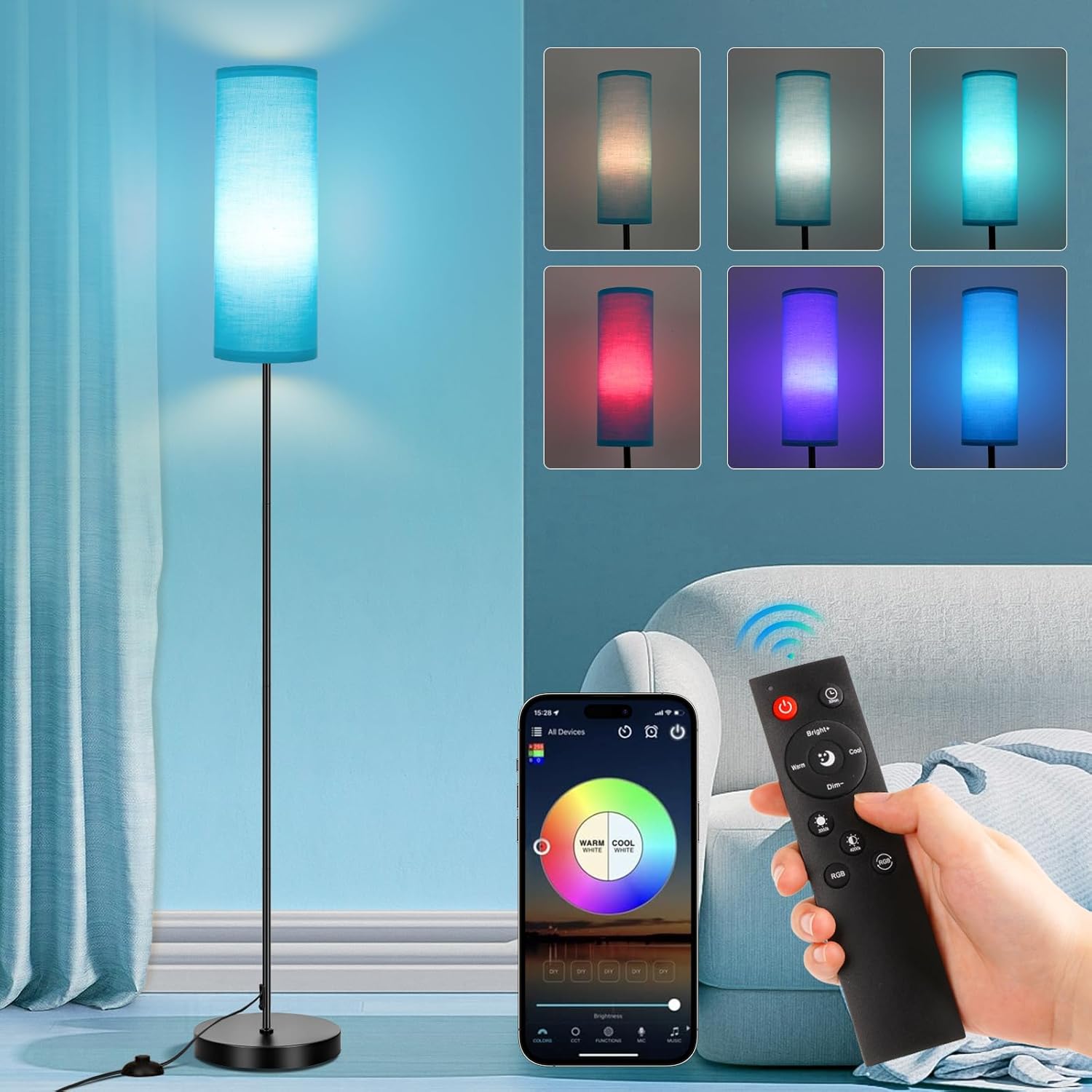 FRIDEKO HOME Floor Lamp for Bedroom, Tall Standing Lamps for Living Room, Modern Corner Floor Lamps for Living Room, 3CCT&Brightness Dimmable, 800 LM, RGB Smart Bulb, Foot Switch, Turquoise Lampshade