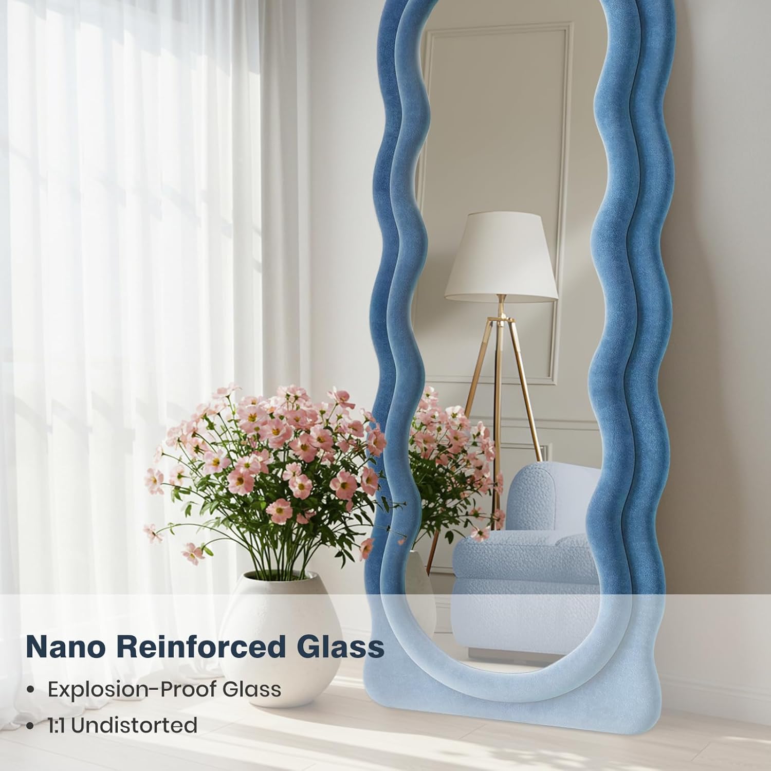- Blue Flannel Irregular Wavy Frame Floor Mirror: The full length standing mirror features a modern style that can complement any type of room decor, adding a touch of elegance to your room. It will be a great wall decor art piece for your home. This full body mirror with sleek looking is also great for selfies or pictures in general