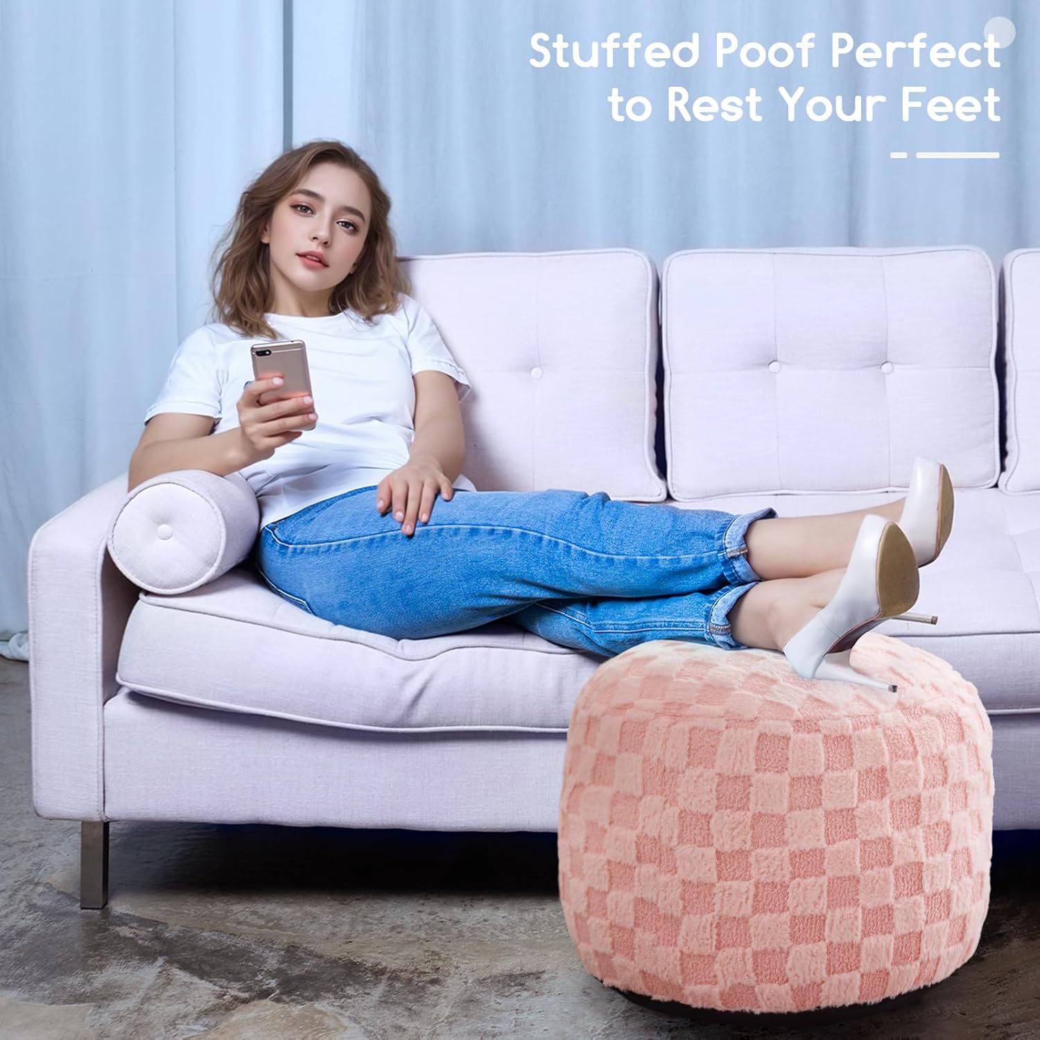 HIGOGOGO Round Stuffed Pouf Ottoman, Plaid Poufs with Foam Chunk Filling, Fluffy and Furry Pouf Foot Stool Storage Ottoman, 20 X 15 Floor Poufs Foot Rest for Living Room, Pink