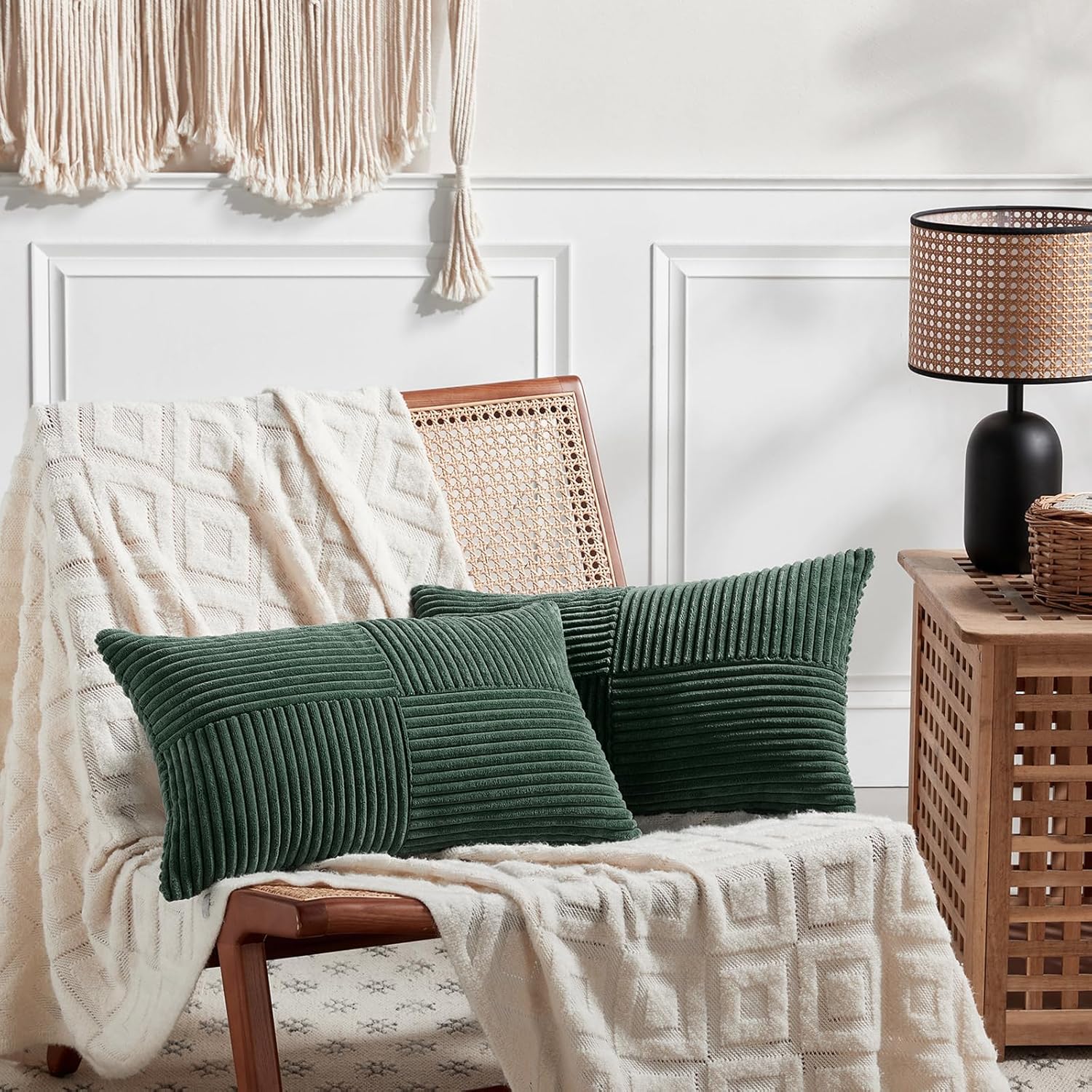 Fancy Homi Set of 2 Dark Green Lumbar Decorative Throw Pillow Covers 12x20 Inch for Living Room Couch Bed, Boho Farmhouse Forest Green Home Decor, Soft Corduroy Corss Patchwork Cushion Case