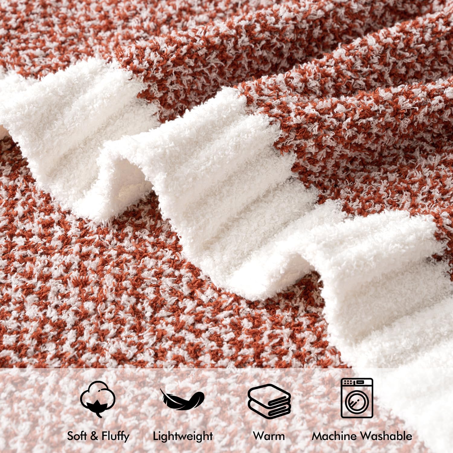 - 【Unique Color Design】Knitted with two different color yarn, our throw blanket shows unique cute color on both side, simple and elegant. Color may be different in different light or on different screen. And the rust blanket could enhance the coziness and warmth of your home during the fall season.When the weather turns cooler, it could create a warm atmosphere and lift your mood.