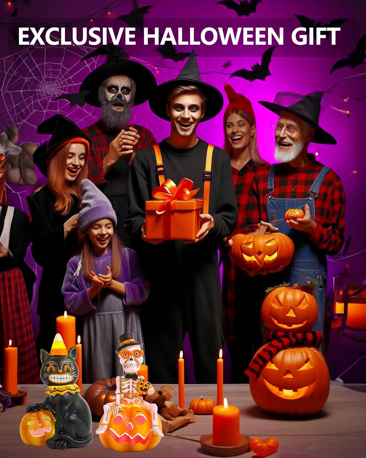 Vintage Halloween Decorations Indoor - 2-Pack 4.7'' Resin Skeleton Gentleman & Black Cat Figurine with Flickering Pumpkin Lights - Halloween Table Decor Ornaments Gifts (Jack-O’-Lantern)