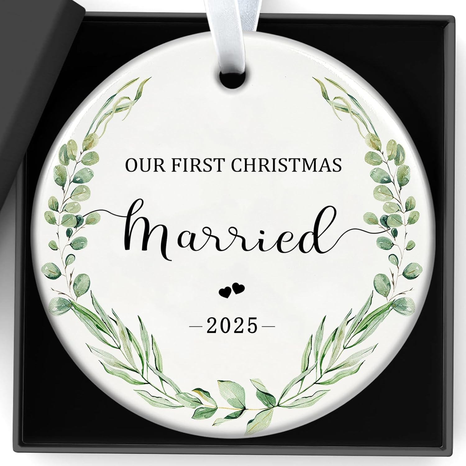 - 【Premium Material】Made from premium ceramic , this 1st Christmas married ornament 2025 ornament is designed for durability and lasting beauty. The dual-sided printing features intricate and vivid designs that won’t fade over time. This premium material of first married Christmas ornament 2025 ensures the ornament remains a cherished keepsake for your family's special moments.