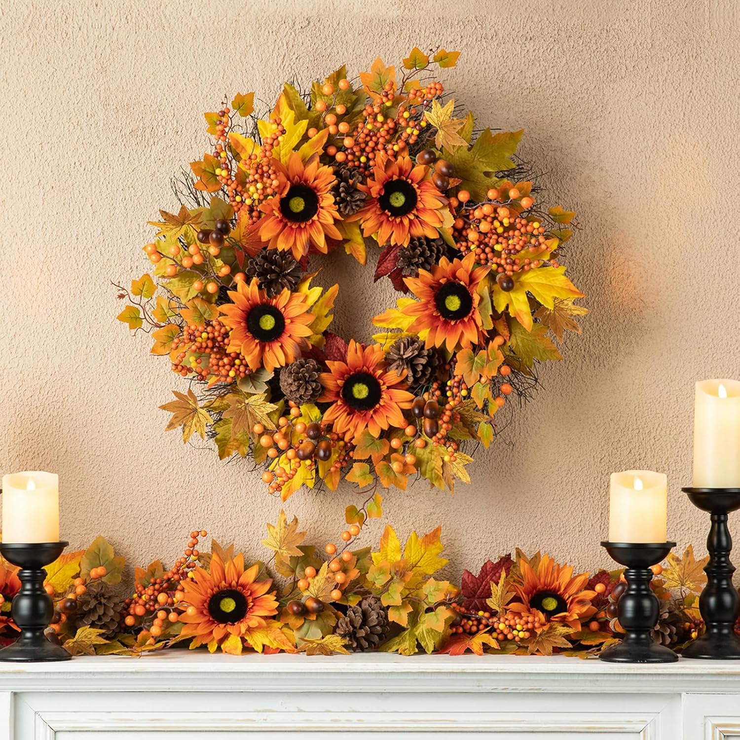 Glitzhome 24'' Fall Wreath for Front Door Decor, Artificial Autumn Orange Wreath with Sunflower, Maple Leaf and Berry Ornament for Wall Fireplace Farmhouse Thanksgiving Day Harvest Festival Decor